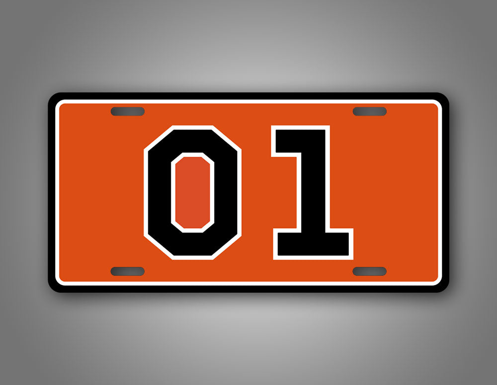This plate refers to the 1969 Dodge Charger, known as the "General Lee" car from the television series "The Dukes of Hazzard." It features an orange backdrop with a black and white border and the text, "01" centered in the middle of the plate.