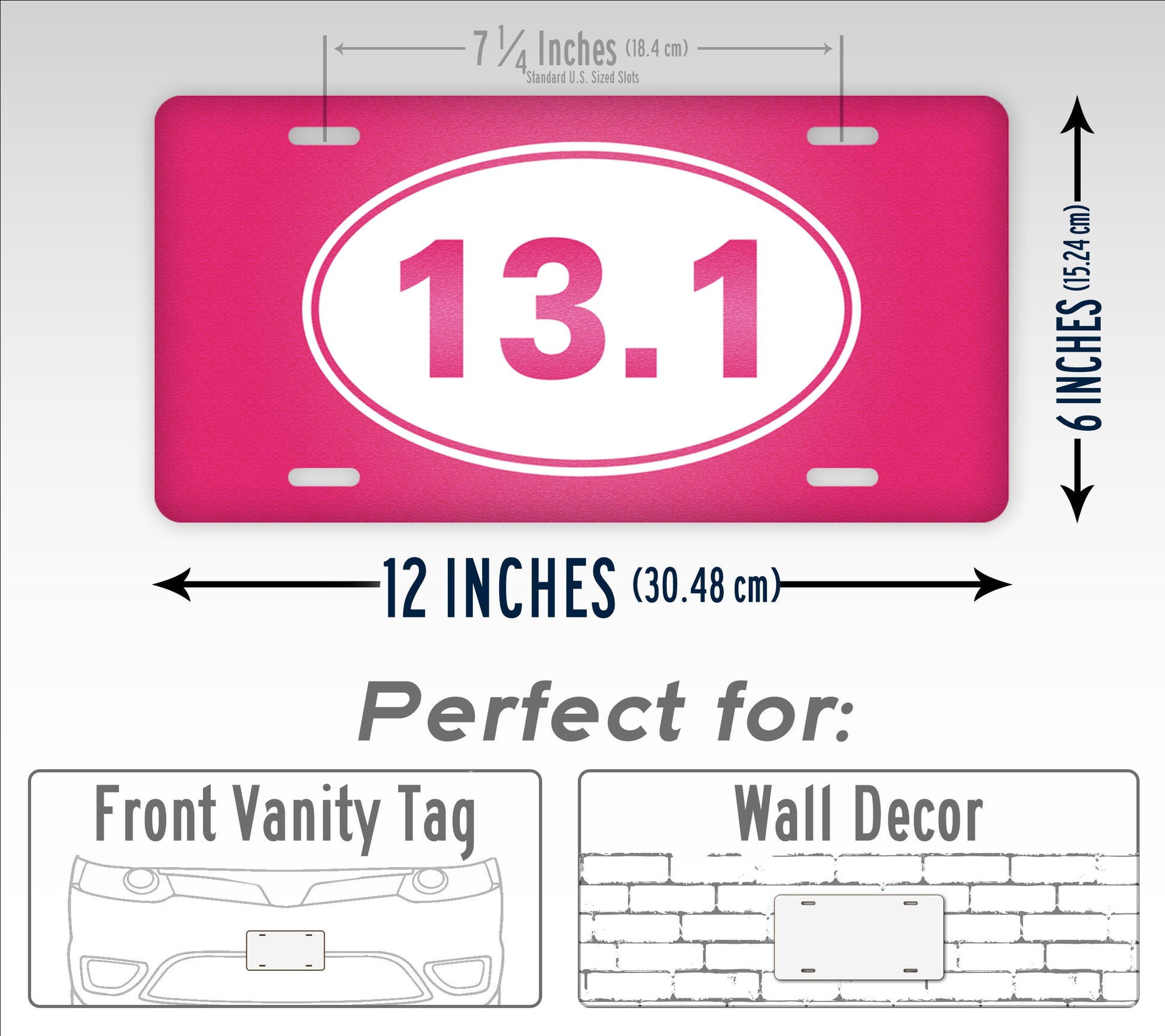 Features the numbers 13.1 centered on the tag with a white oval around the numbers. Choose either the pink or blue option. Please note that the colorations are our spin on the standard pink/ blue. They are gradients and have several different shades of the respective colors worked into the color scheme of the auto tag.