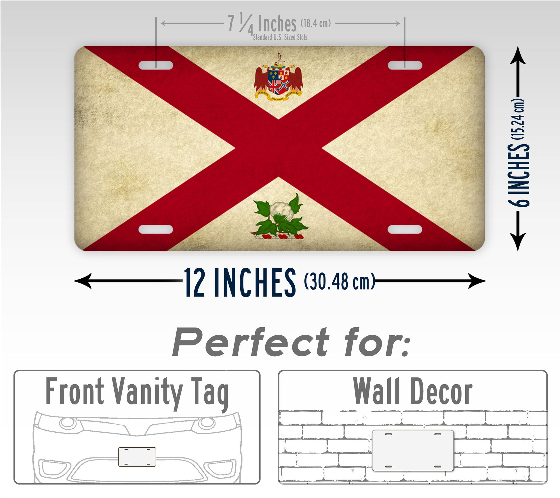 Get it with or without the coat of arms design elements. if you get the plate with the "Coat of arms" design elements, then this auto tag would technically be a reproduction of the "Governor's flag" of Alabama.