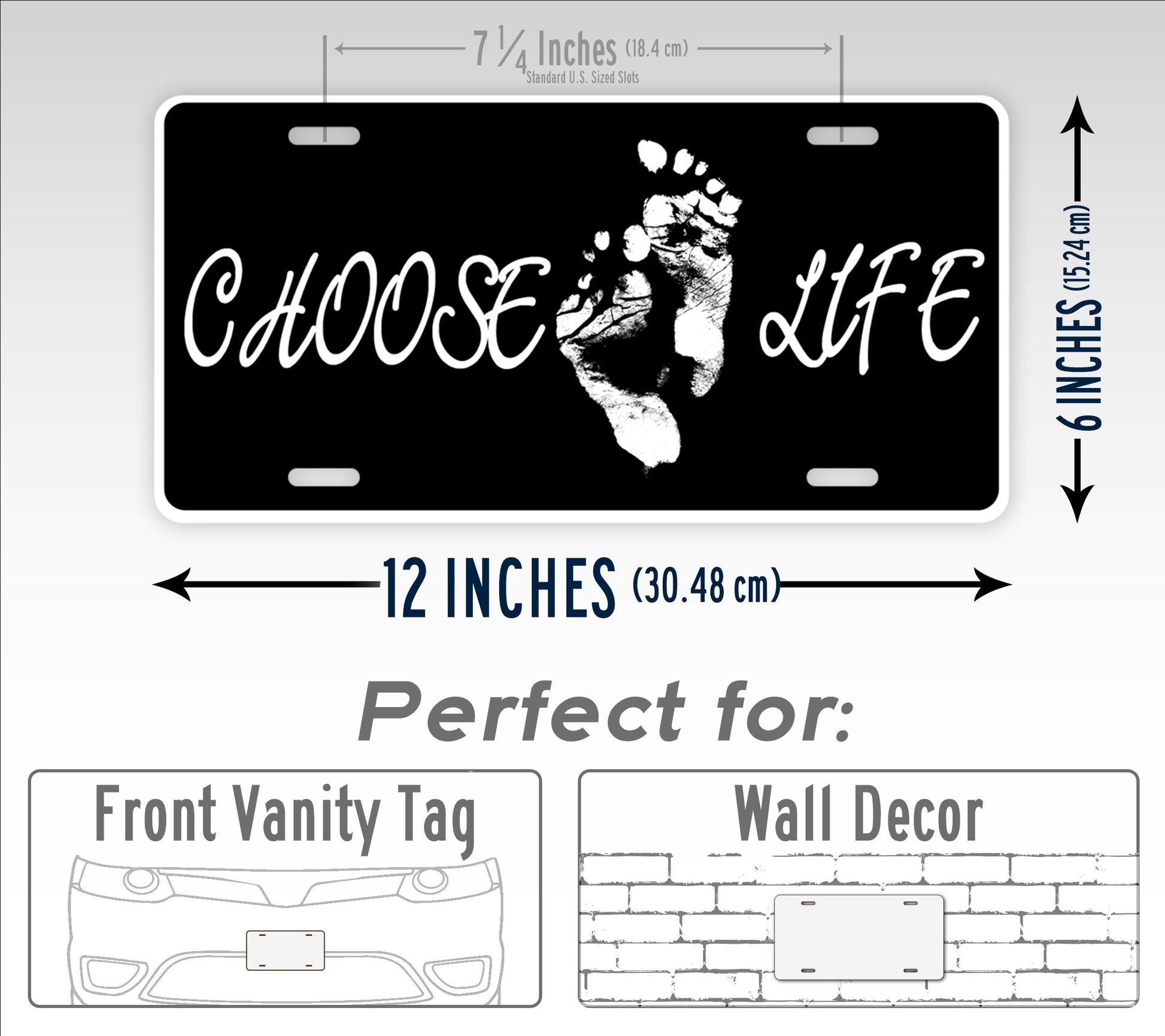 Boldly proclaim your position on the pro-life issue with this black and white license plate! It features the text, "Choose Life" in large cursive letters with the imprint of baby feet in between the words.