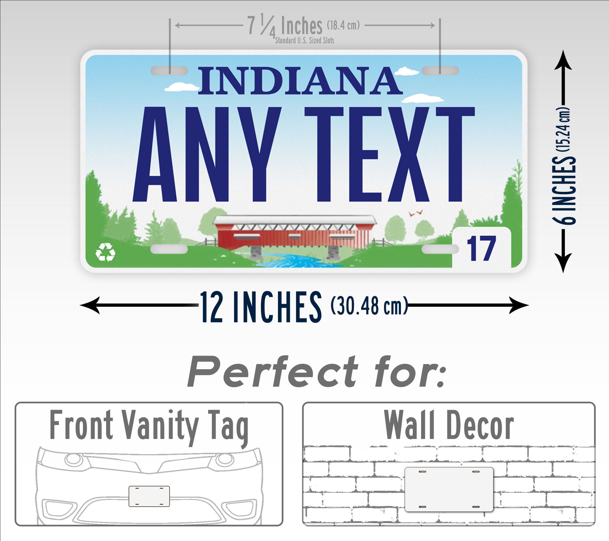 This license plate is a replica of Indiana's official tag that has been issued since 2017.  It features a dark blue font on a country scene graphic featuring a covered bridge. The custom year and recycling symbol are in the bottom corners. The main text and the year can both be customized.