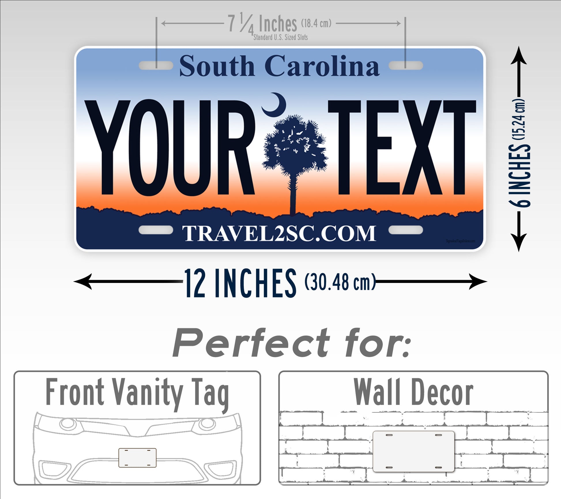 This is a replica South Carolina state license plate that from 2008 to 2016. Customize the main text however you want. If there are spaces between your text the palmetto tree will be in the center if there are no spaces the palmetto tree will be faded into the background.