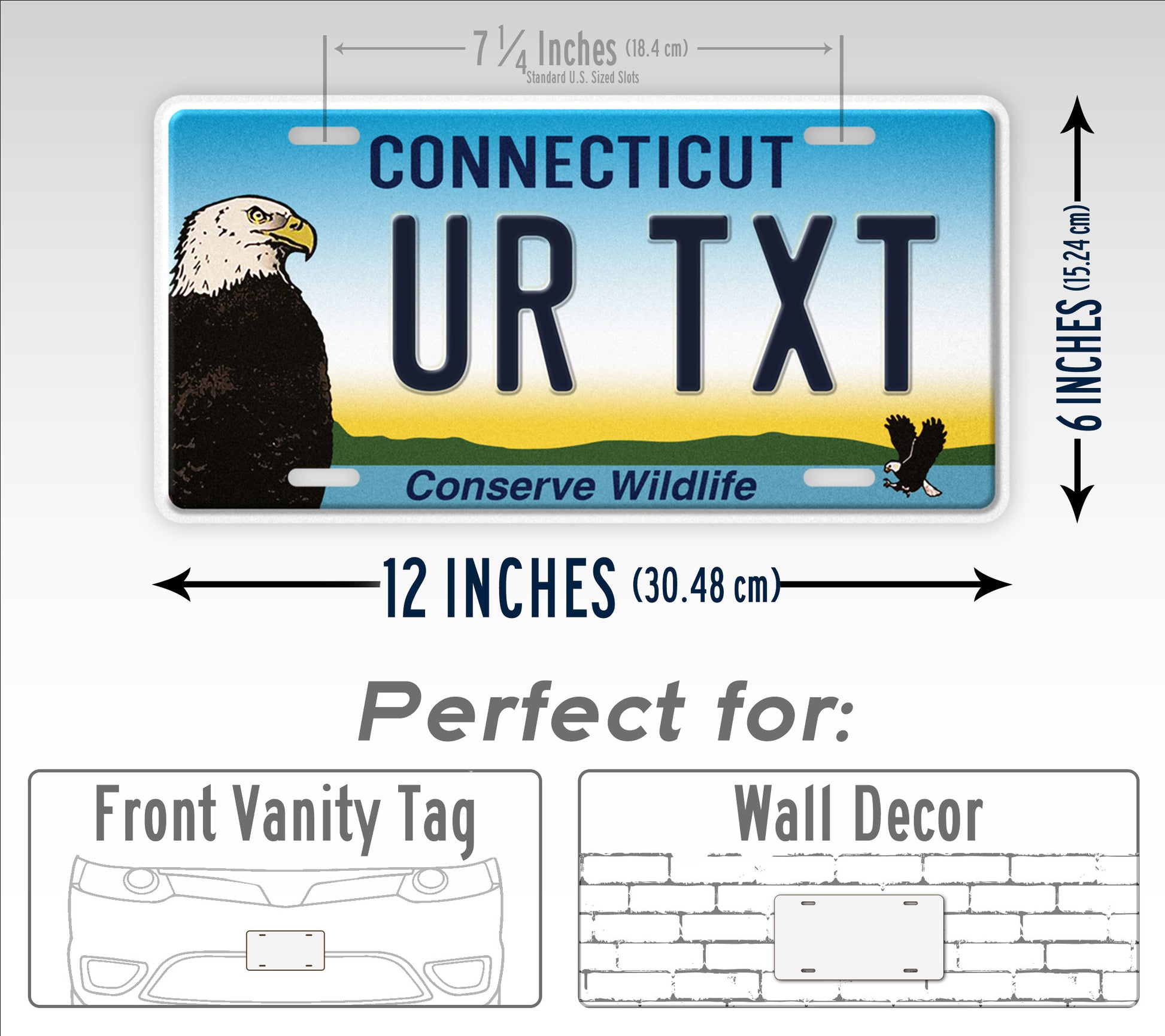 This is a replica of Connecticut's, "Conserve Wildlife" license plate. It features a perched Bald Eagle to the left of your custom dark blue text. Water, green hills and yellow sky are along the bottom of the plate and a flying bald eagle is in the bottom right hand corner. The small text, "Conserve Wildlife" is centered on the bottom and, "Connecticut" is across the top on the blue sky.