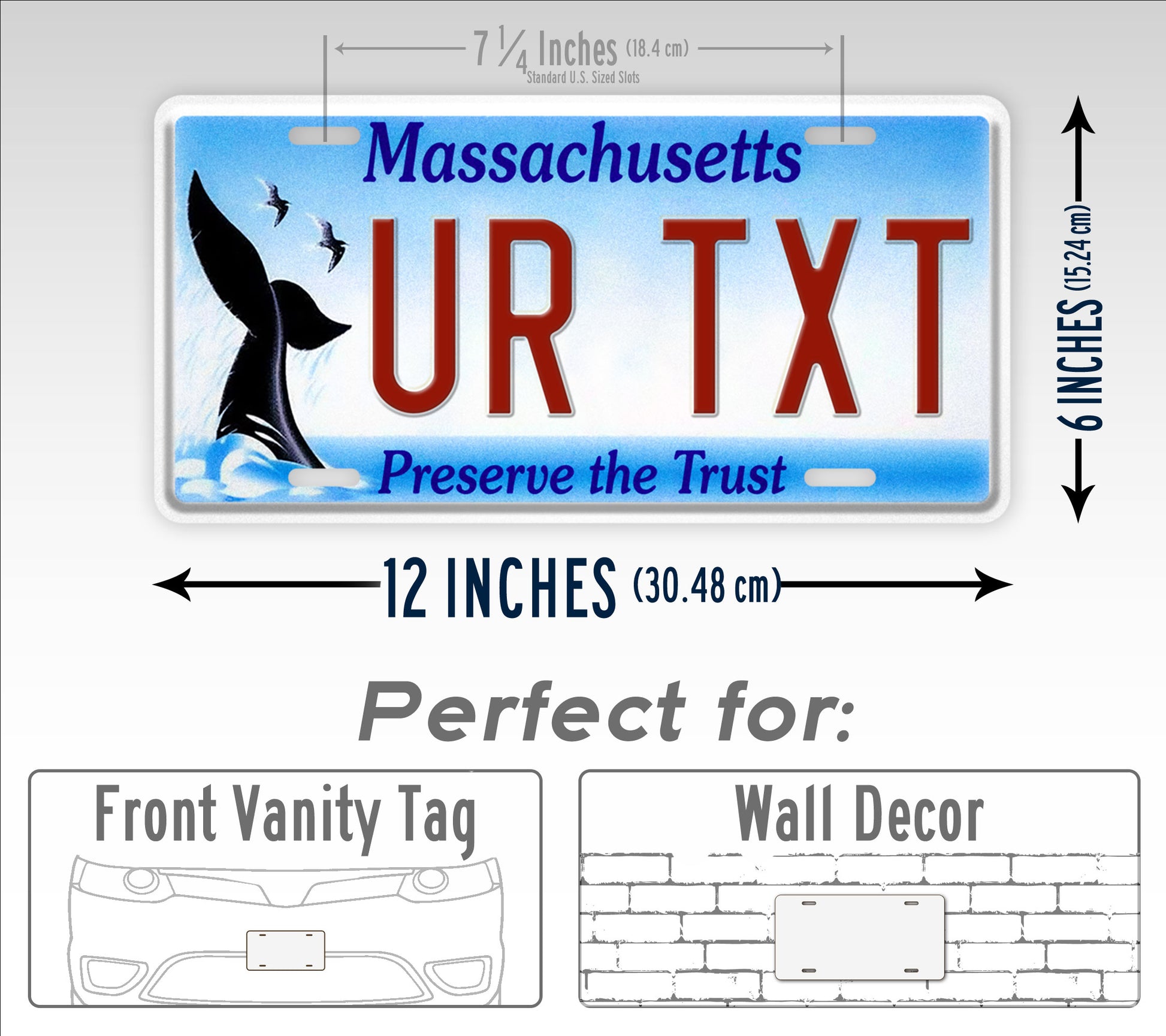 This is a replica of the "Preserve The Trust" whale-themed MA license plate, representing the efforts of the Massachusetts Environmental Trust to protect the waterways, oceans, and wildlife. To the left of your custom red text, is a whale's fin splashing back into the bright blue water and Roseate Tern birds in flight. The word, "Massachusetts" is centered on top of the plate and, "Preserve The Trust" on the bottom.