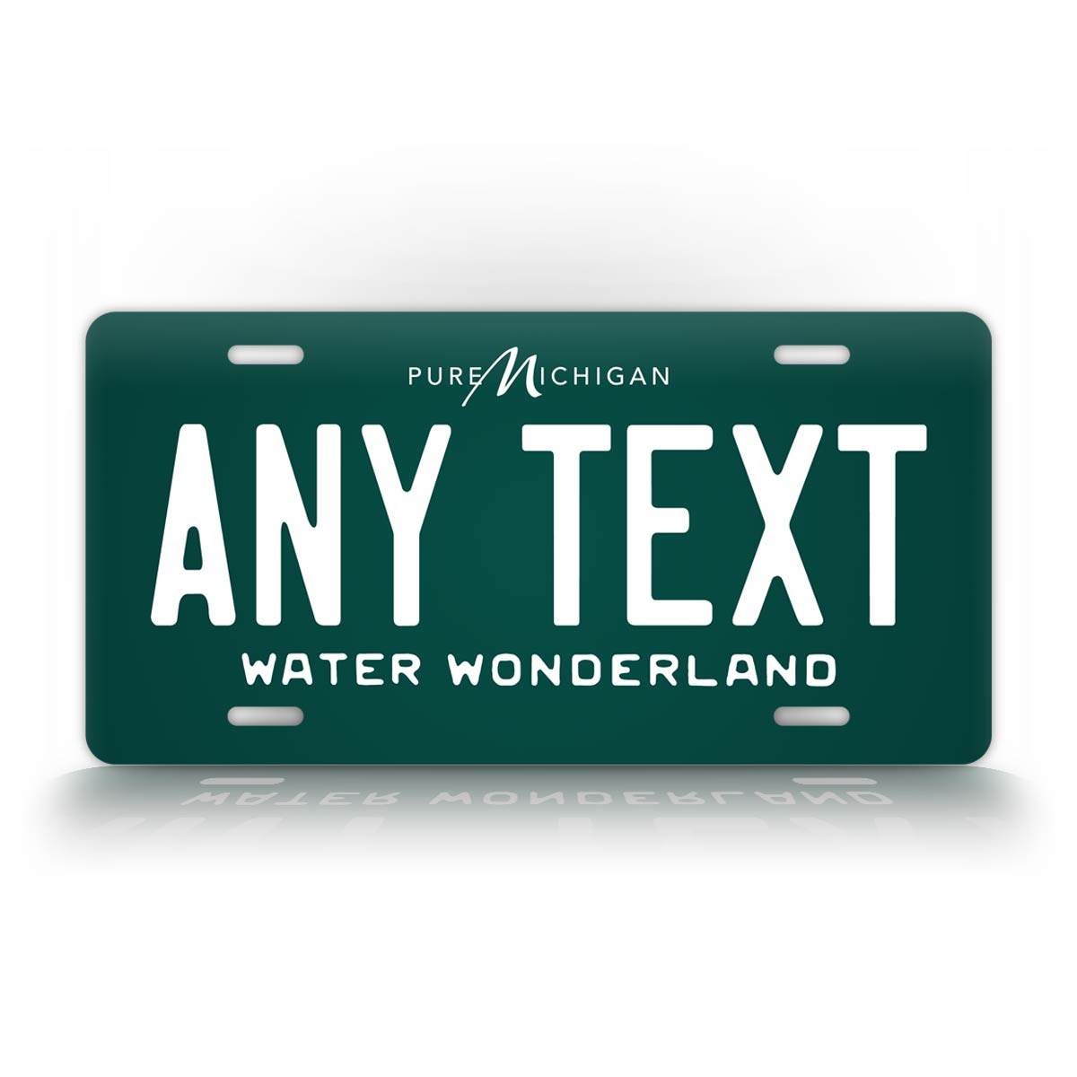 This plate features bold white custom text on either the dark or lighter green backdrop of your pick. The words, "Water Wonderland" are below the personalization and the small text, "Pure Michigan" is centered on top.