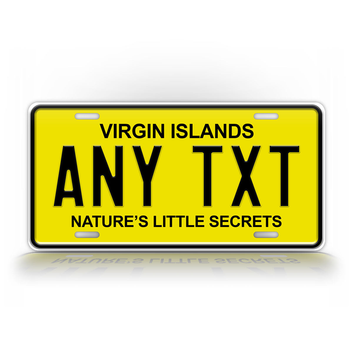 This Virgin Islands plate has a bright yellow background and black custom text. Featuring the words, "Virgin Islands" centered on top and the British Virgin Islands slogan, "Nature's Little Secrets" placed on the bottom. The Virgin Islands were originally owned by the Danish and the British, but the Danish portion was sold to the United States in 1917, thus making the islands divided between the British and US today.
