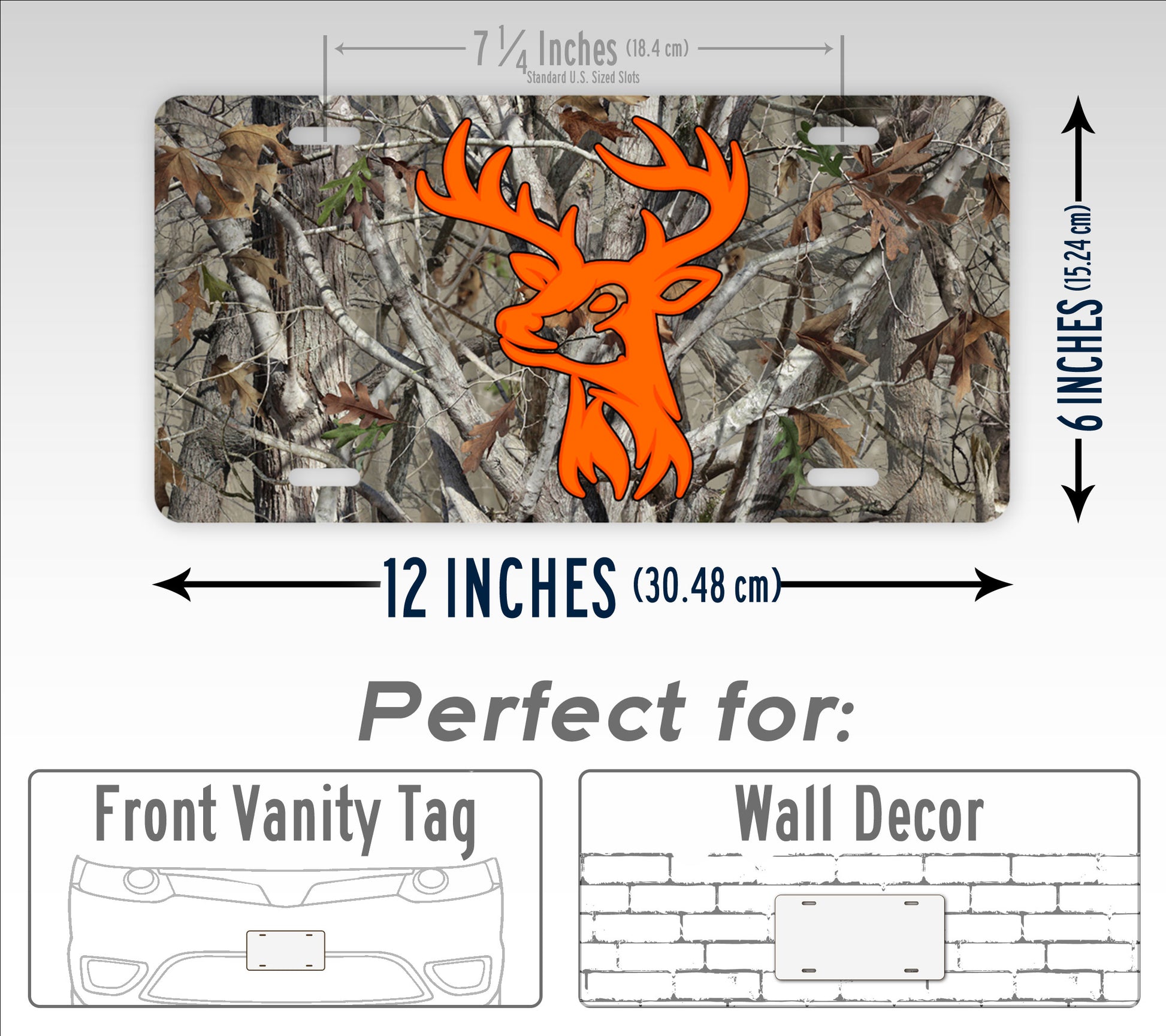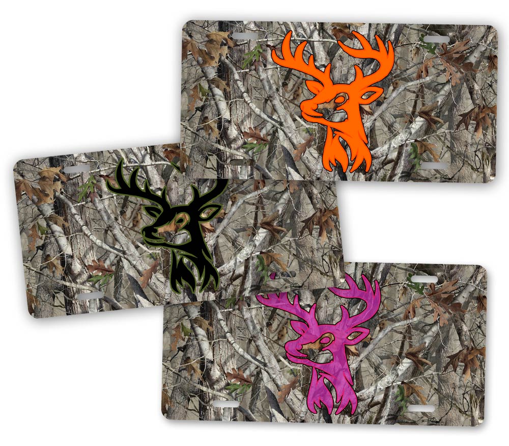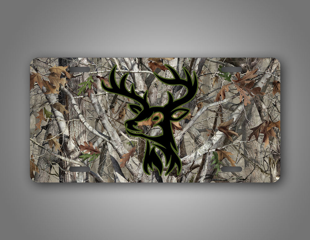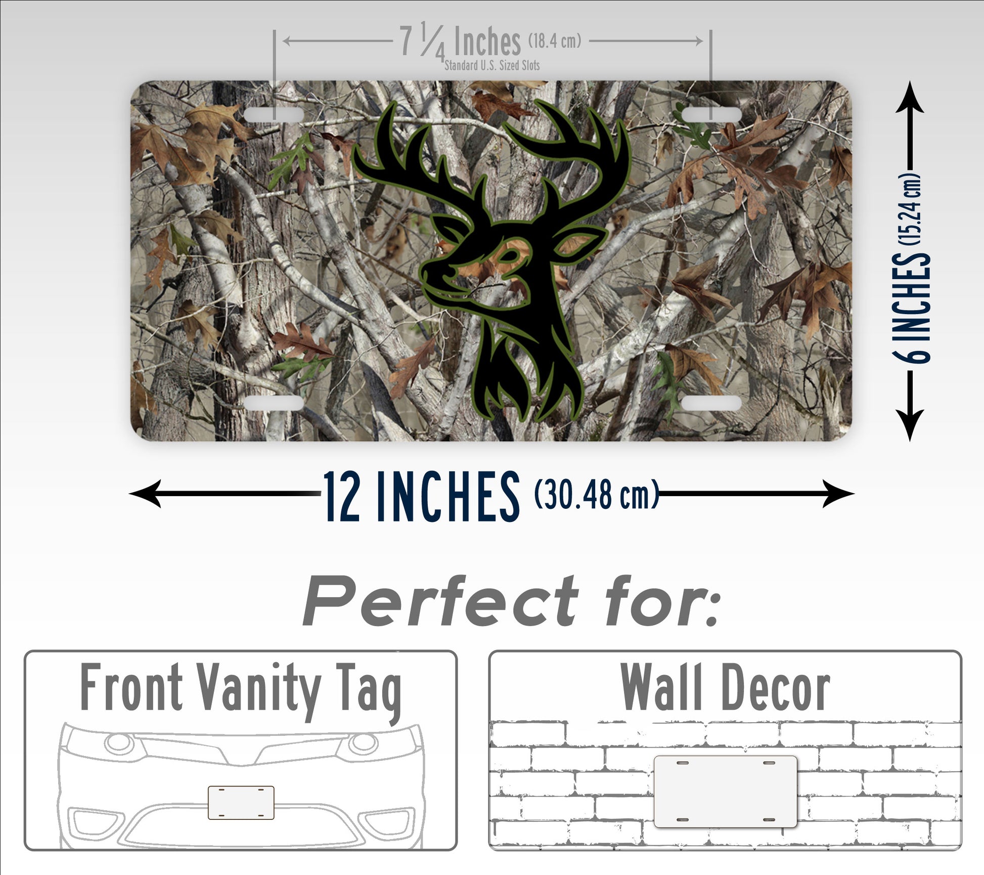 This license plate features a woodsy, camo background with a distinguished buck head in the center. This silhouette is sure to look stunning on the front of your truck!