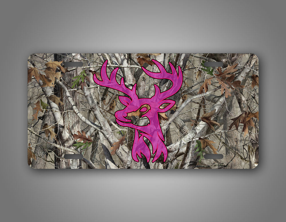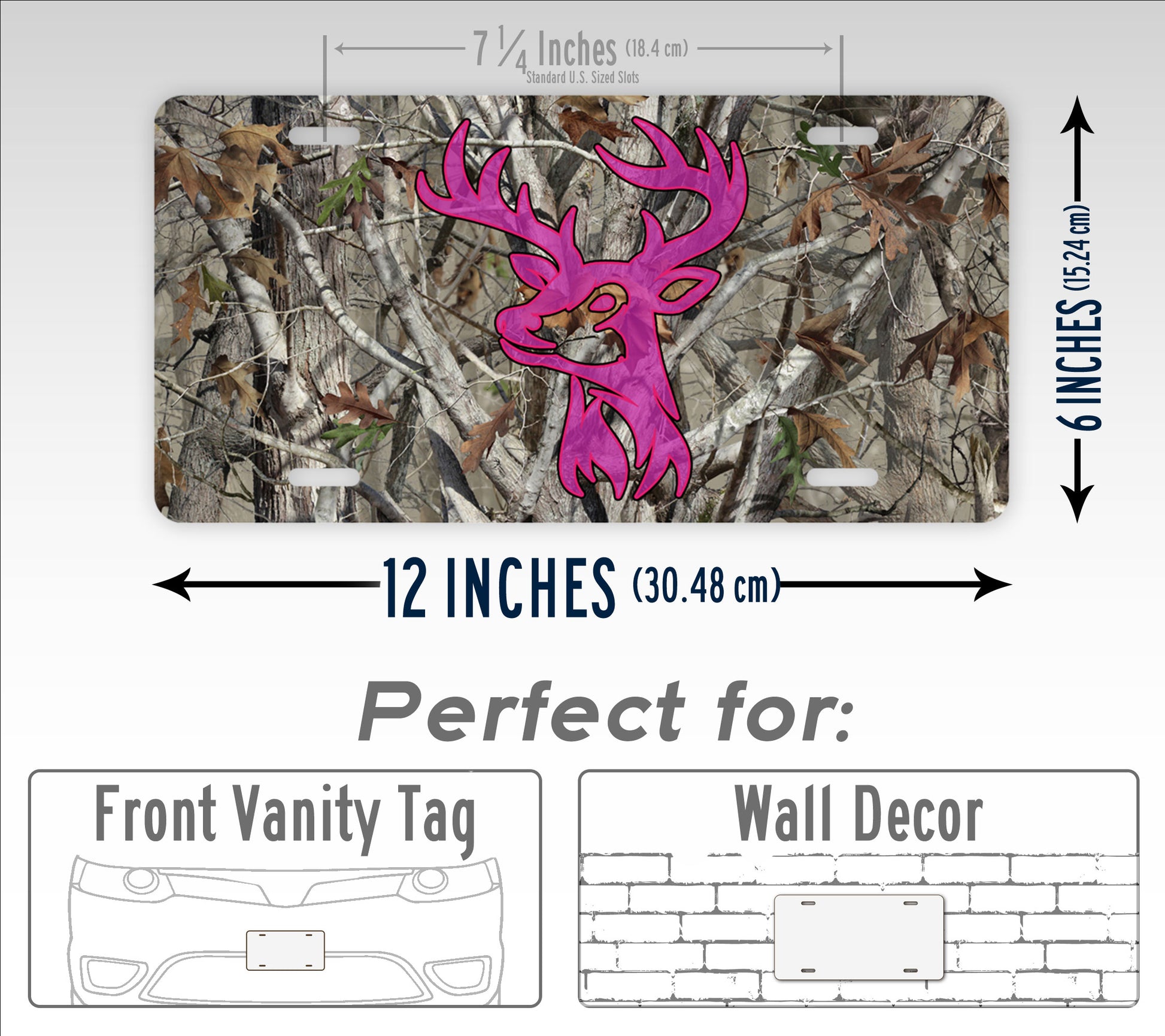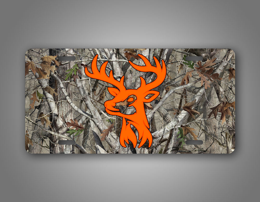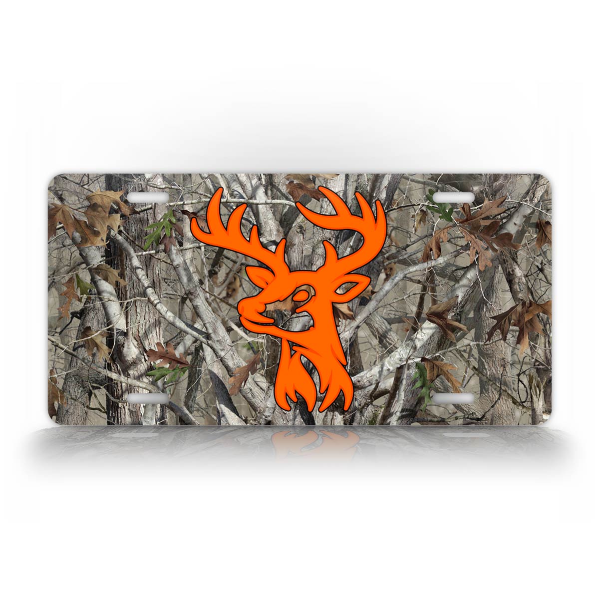 This license plate features a woodsy, camo background with a distinguished buck head in the center. This silhouette is sure to look stunning on the front of your truck!