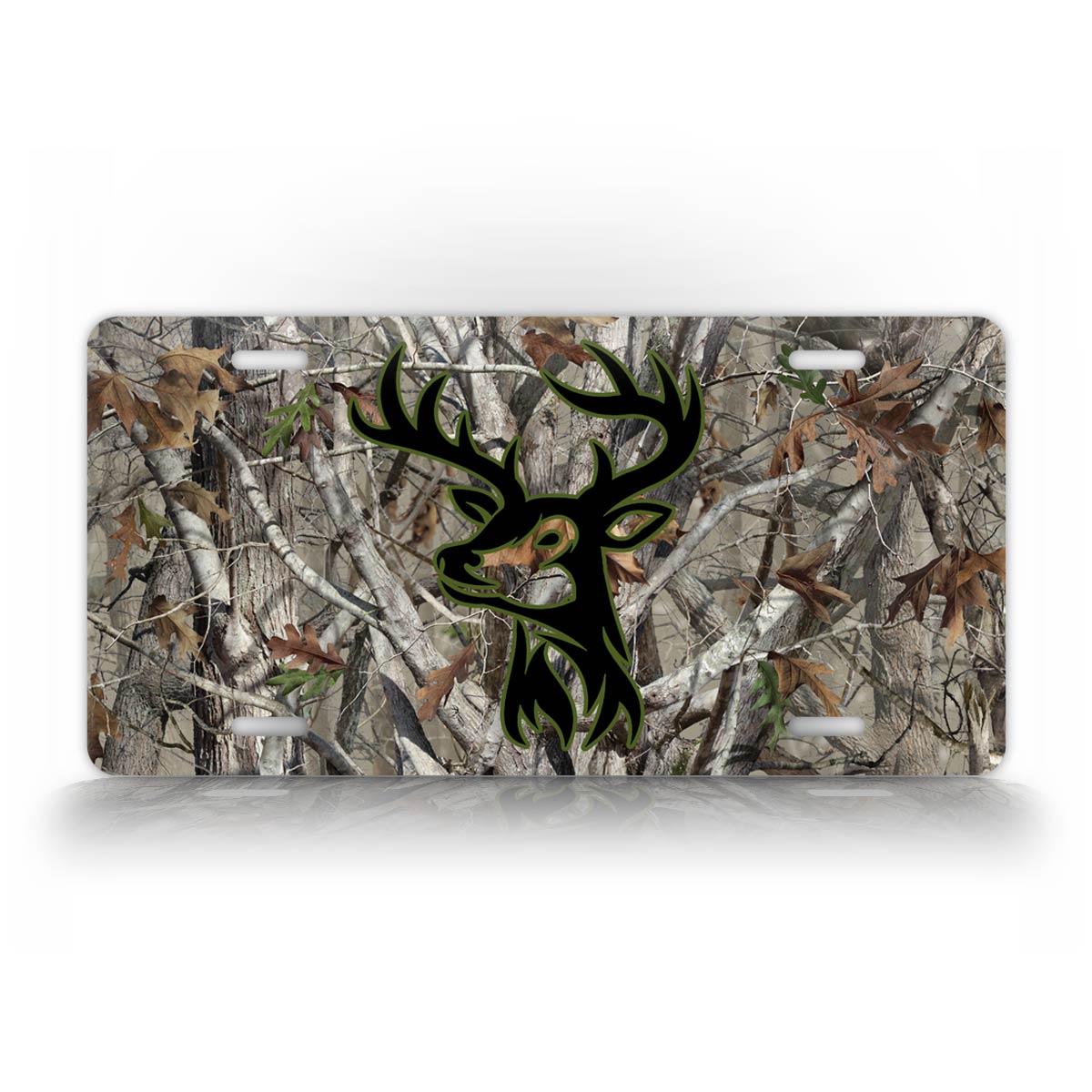 This license plate features a woodsy, camo background with a distinguished buck head in the center. This silhouette is sure to look stunning on the front of your truck!