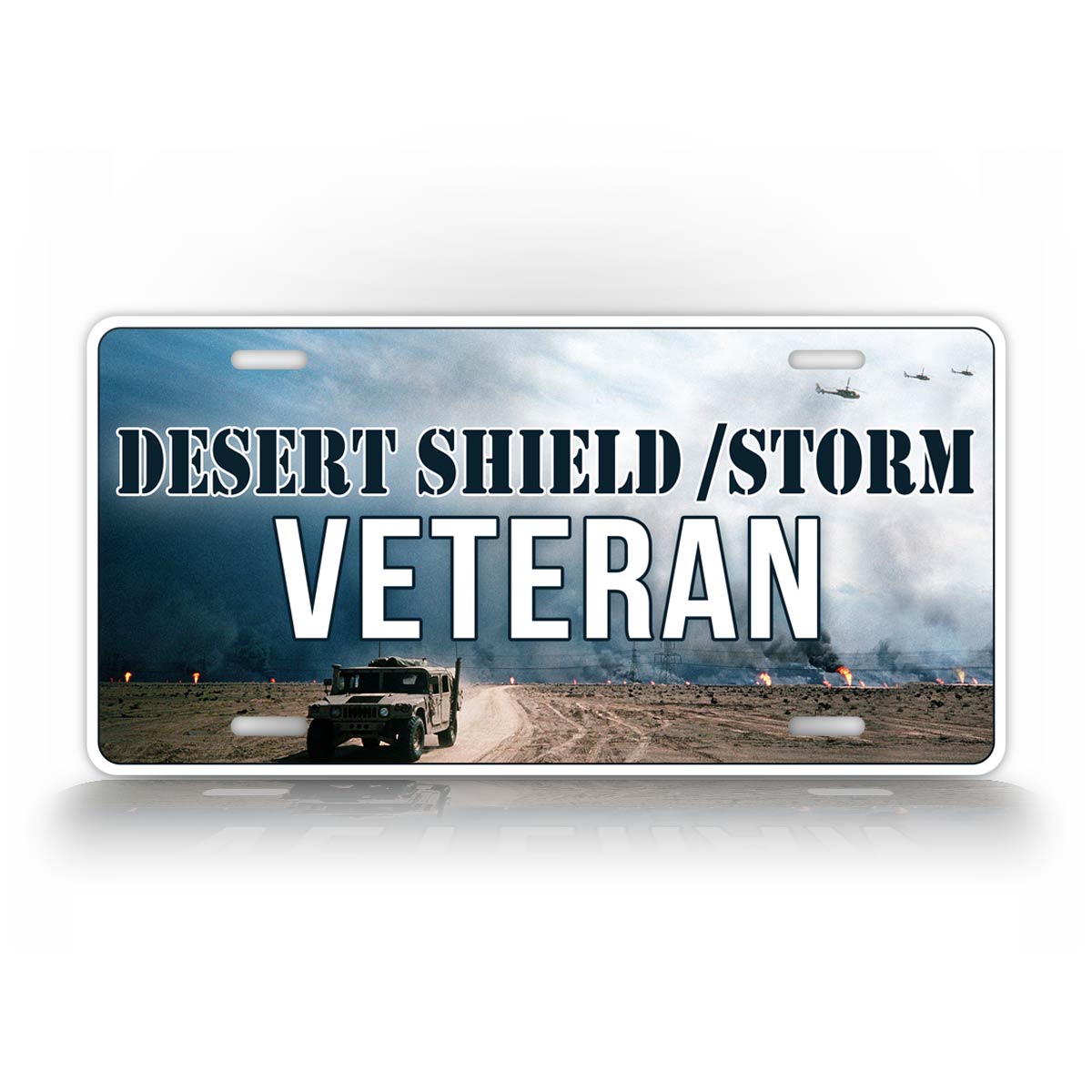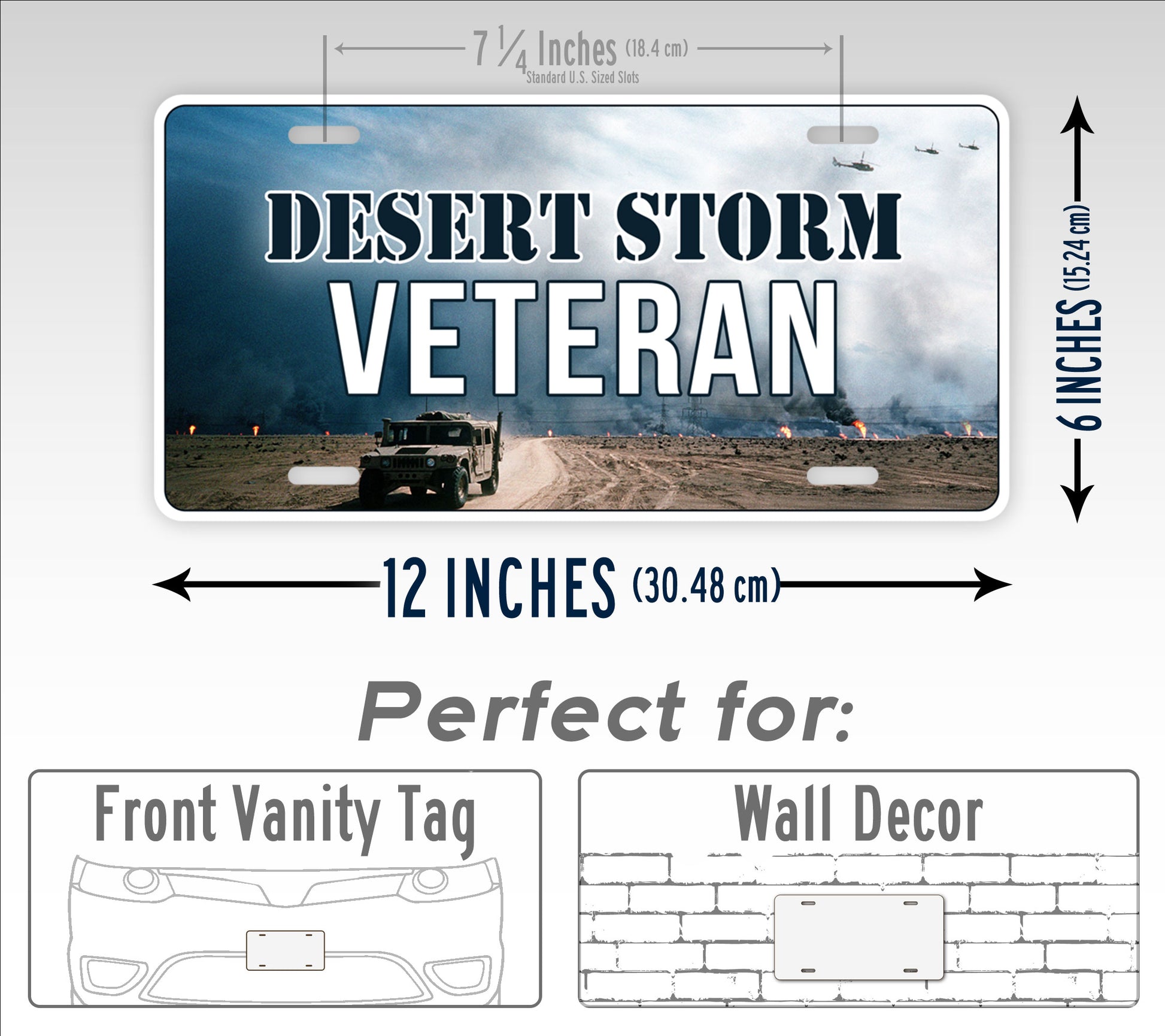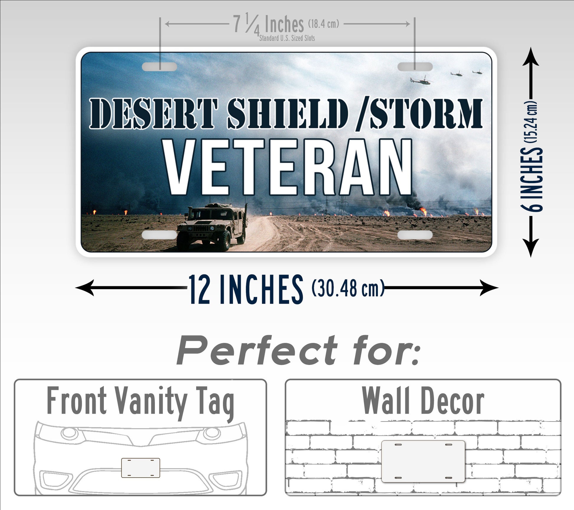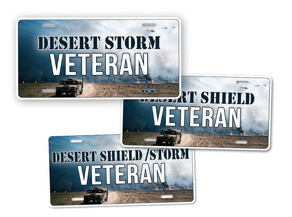 This license plate features a photo of a Humvee with burning oilfields in the background, and the bold text Desert Storm Veteran. The options, "Desert Shield, Desert Storm or Desert Shield/Storm" can also be chosen. This bold eye catching auto tag is sure to stand out on any vehicle.