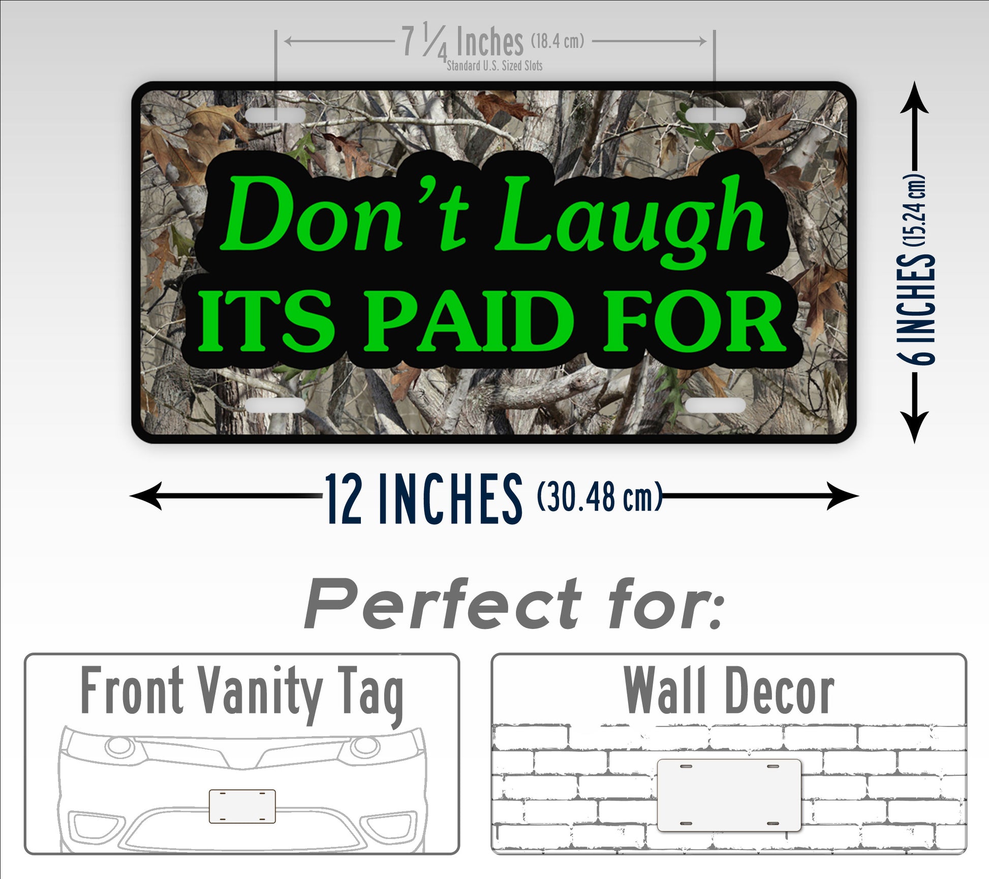 Let your car wear this tag with pride! It features the text, "Don't Laugh it's Paid for" set overtop a camo redneck-styled background.
