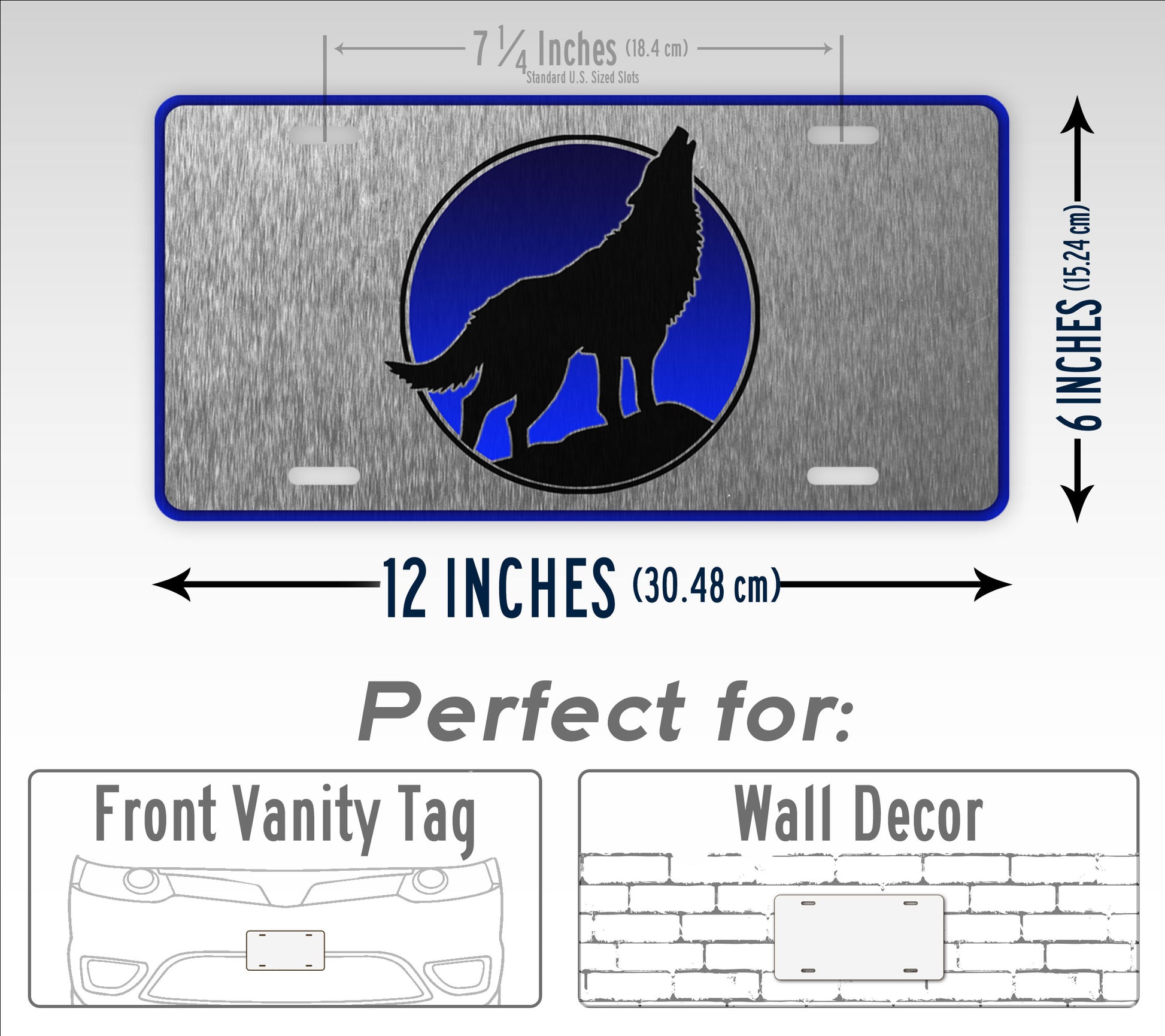 This is one of our classy silver license plates. It features a brushed silver background with a howling wolf silhouetted against a dark blue night sky. The color combination is striking and would look stunning on any vehicle.