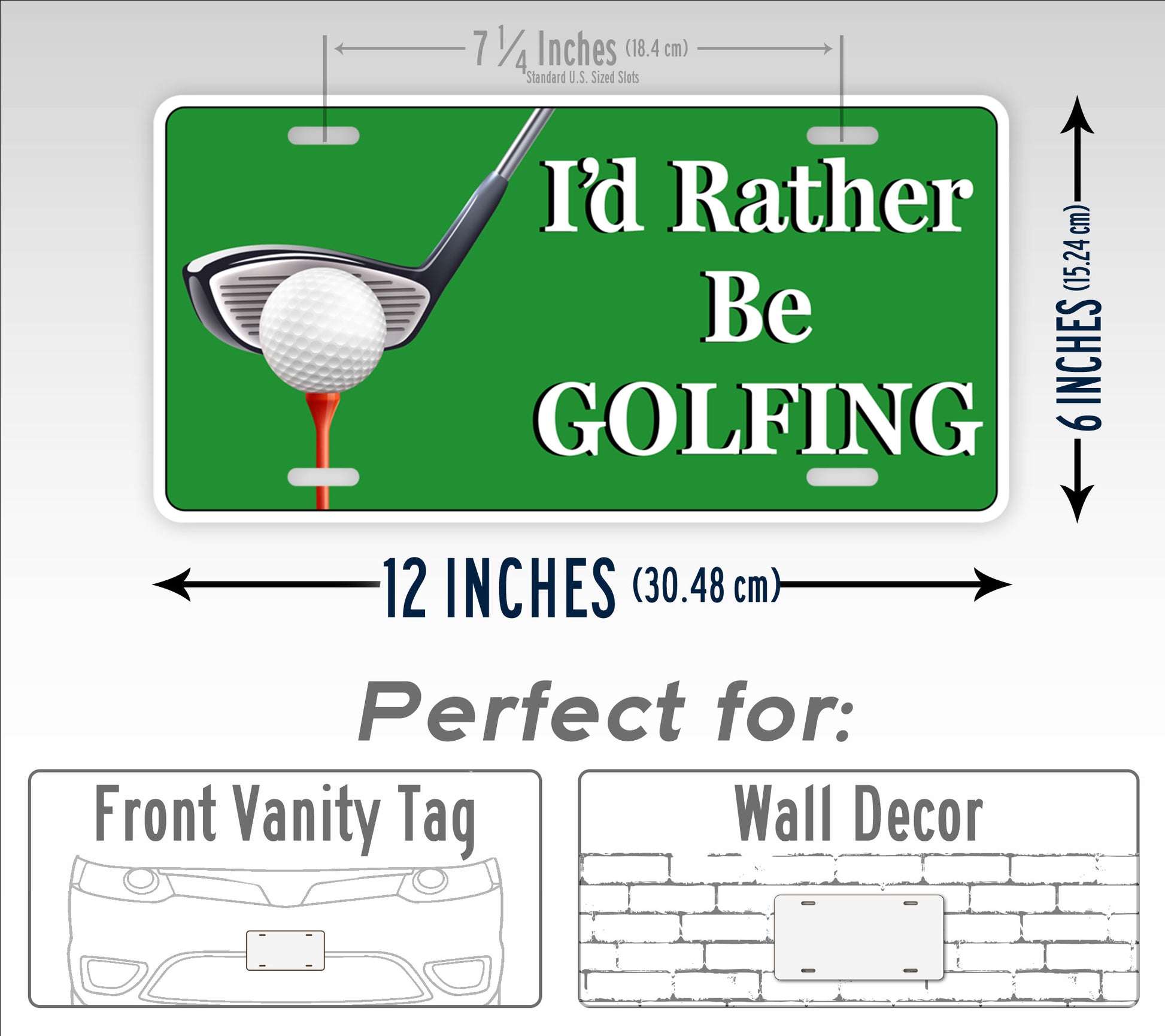 This license plate features a bright green background with the text "I'd Rather Be Golfing" and a golf club and ball to the left of the text. This auto tag is sure to look great on the front of any passionate golfer's vehicle.