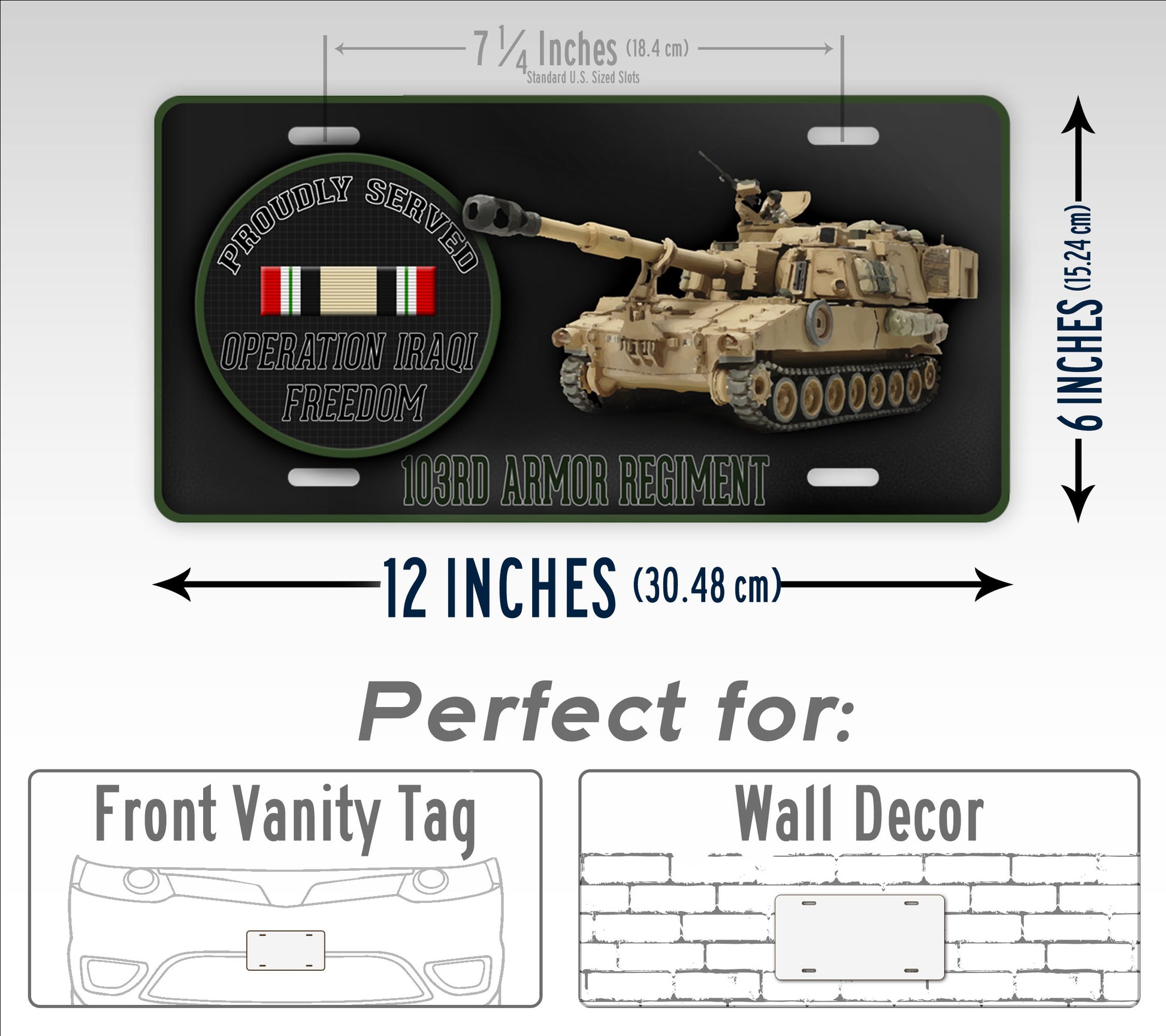 This Iraqi Freedom veteran license plate features a painting of a Paladin howitzer tank to the right, and the Iraq campaign medal in the center of a logo with the text "Proudly Served. Operation Iraqi Freedom." At the bottom center is a place for you to add your own personalized text. This polished auto tag would look sharp on any vehicle.