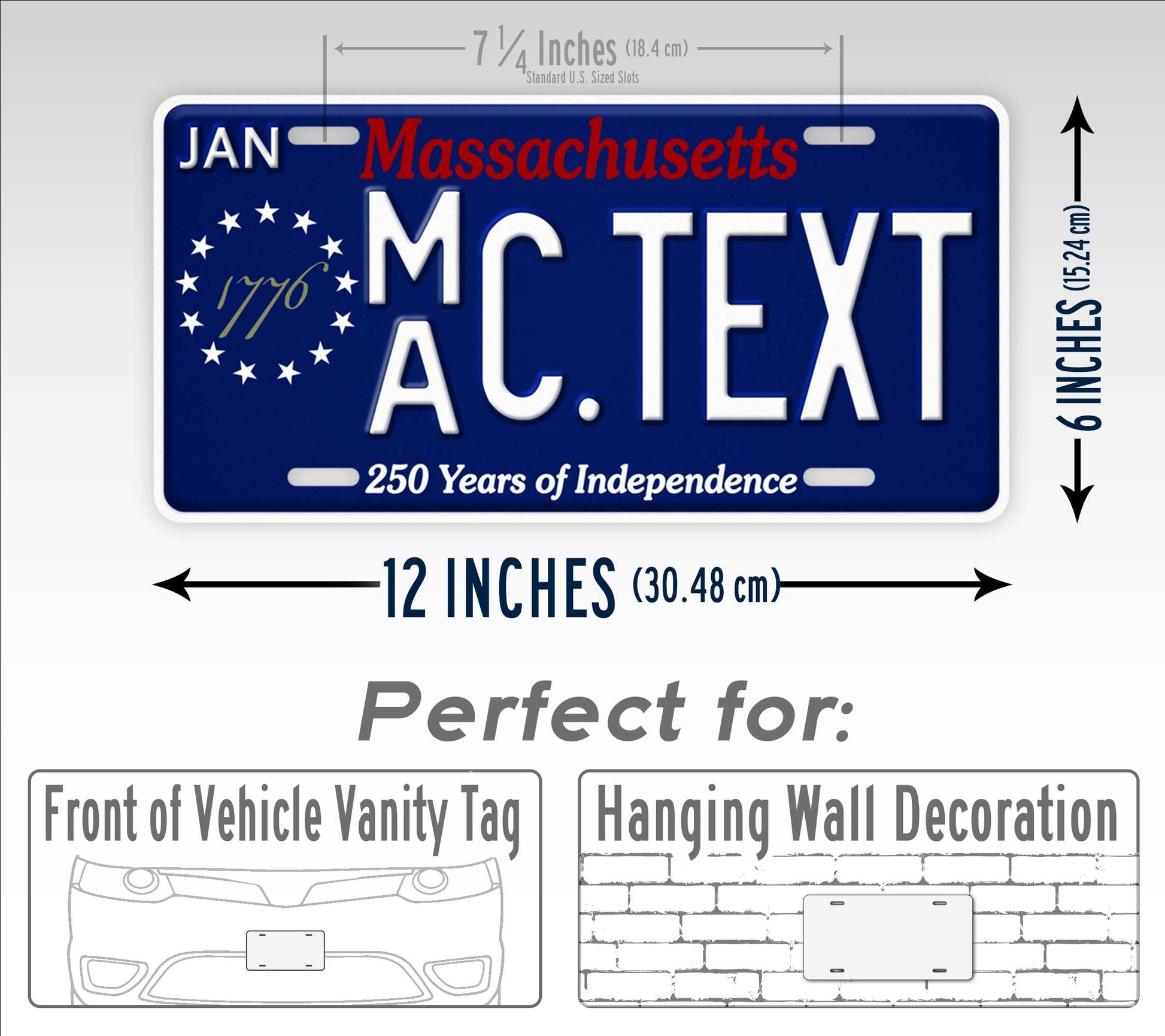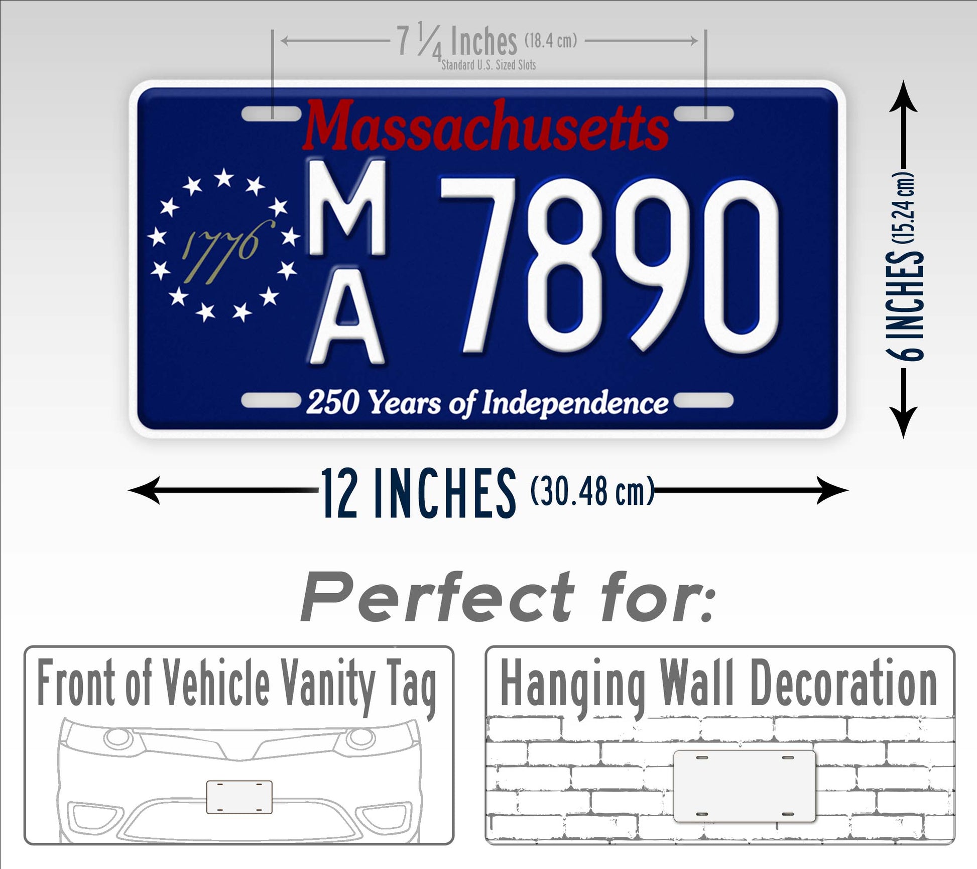This license plate is our novelty replica of the extremely popular, blue "specialty plate" in Massachusetts. Note, this is not the standard issue tag. The Registry of Motor Vehicles (RMV) is issuing this as a special 2 year tag. Fore more details, please visit this government page. Note: We are not affiliated with the RMV, and our novelty plate is not legal for official use.  It features a bold blue background with the red text on top, "Massachusetts." On the left edge of the tag is the circle of 13 stars representing the original founding colonies of the Unites States of America. In the center is the text in an antique style font, "1776." At the bottom of the plate is the text, "250 years of independence."