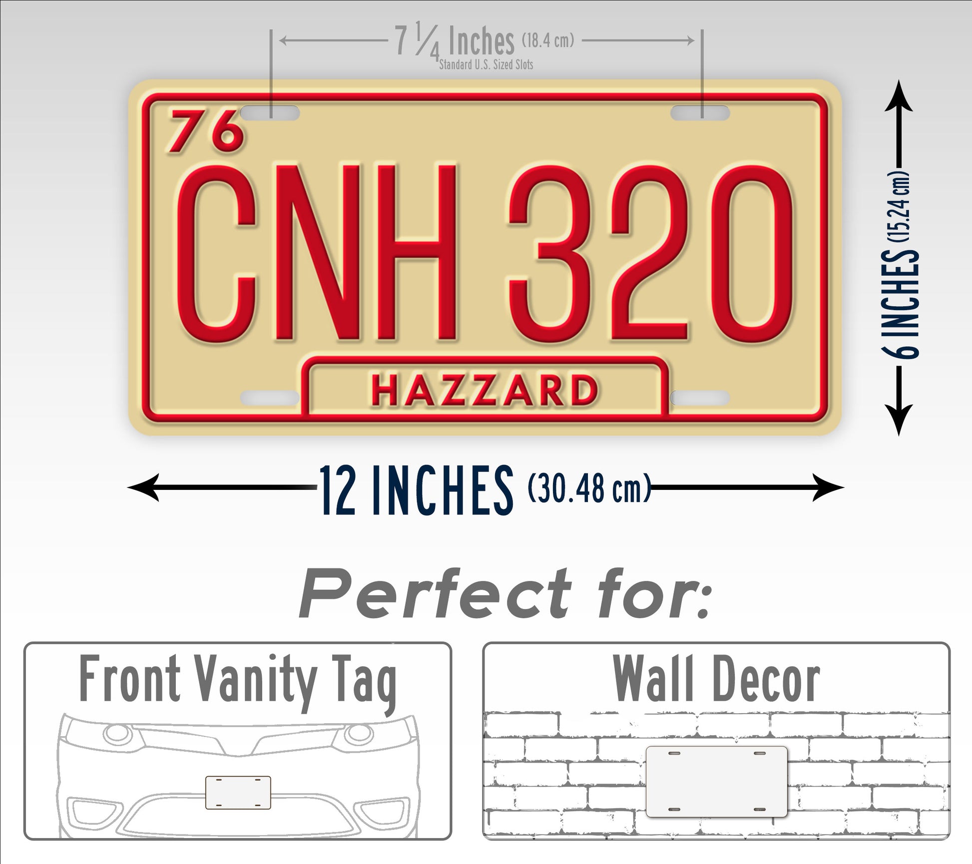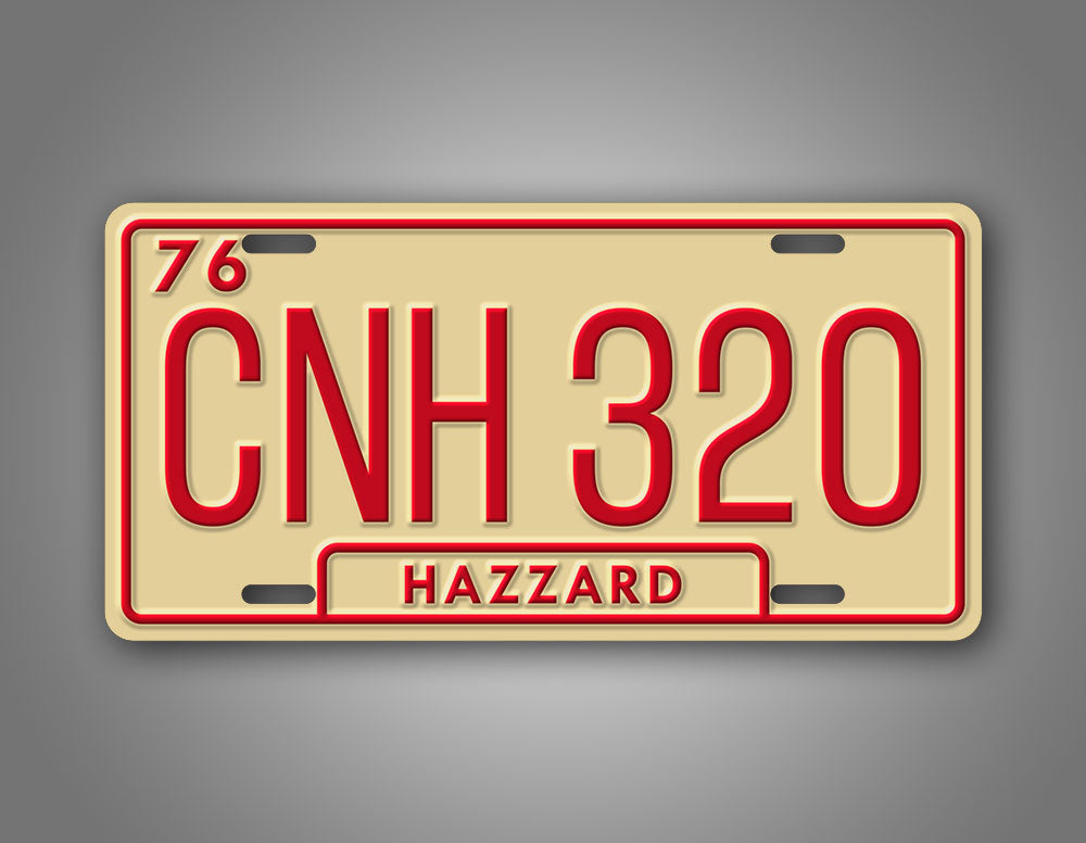 This tan and red license plate is a replica of the, "General Lee" car tag from The Dukes of Hazzard television series from 1979. The number, "76" is in the upper left hand corner above the text, "CNH 320" and the small word, "Hazzard" centered on the bottom of the plate.