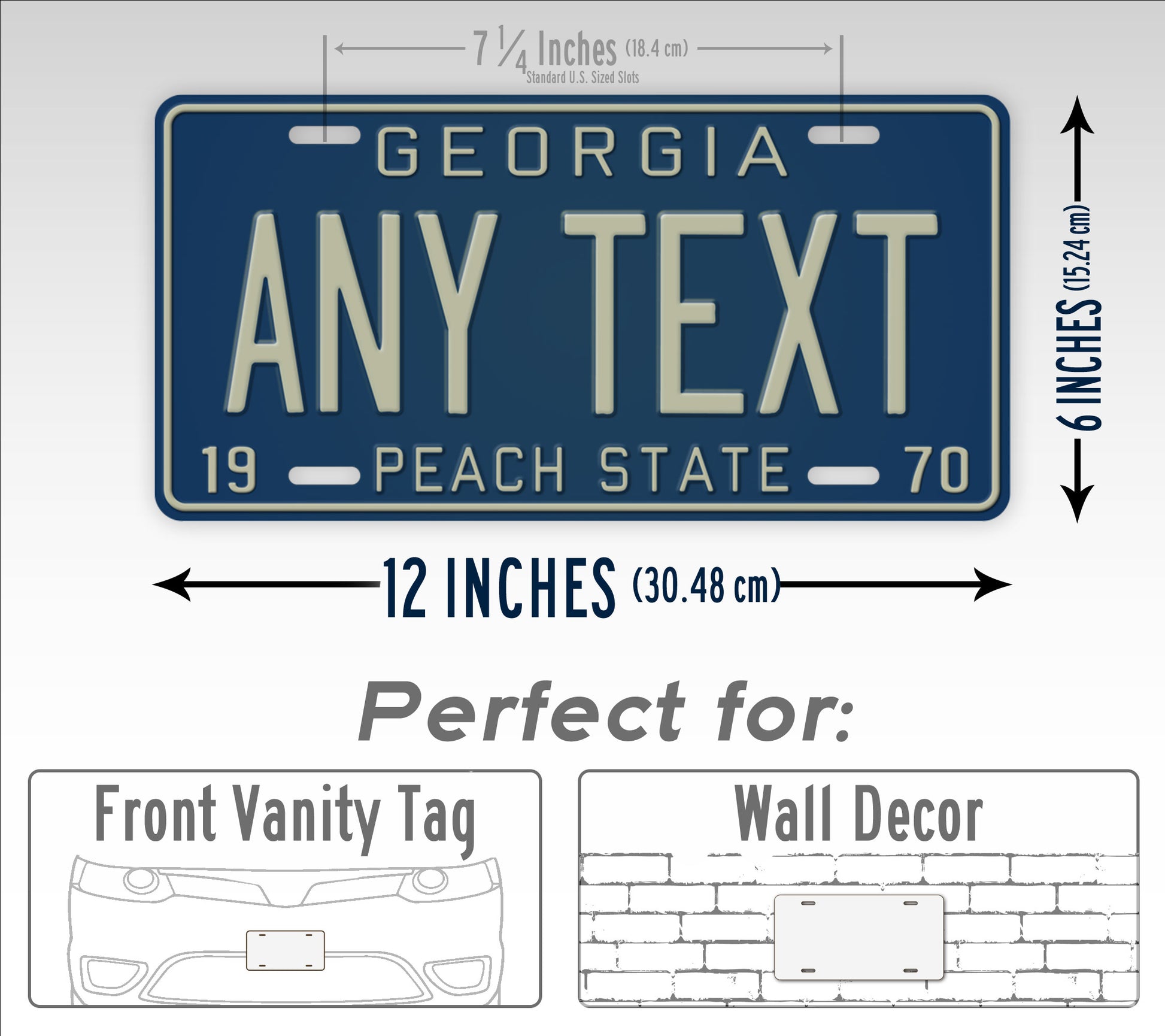 Plate dimensions are standard for U.S. plates (6" x 12"). Unless otherwise noted, all license plates are not embossed but are flat metal.