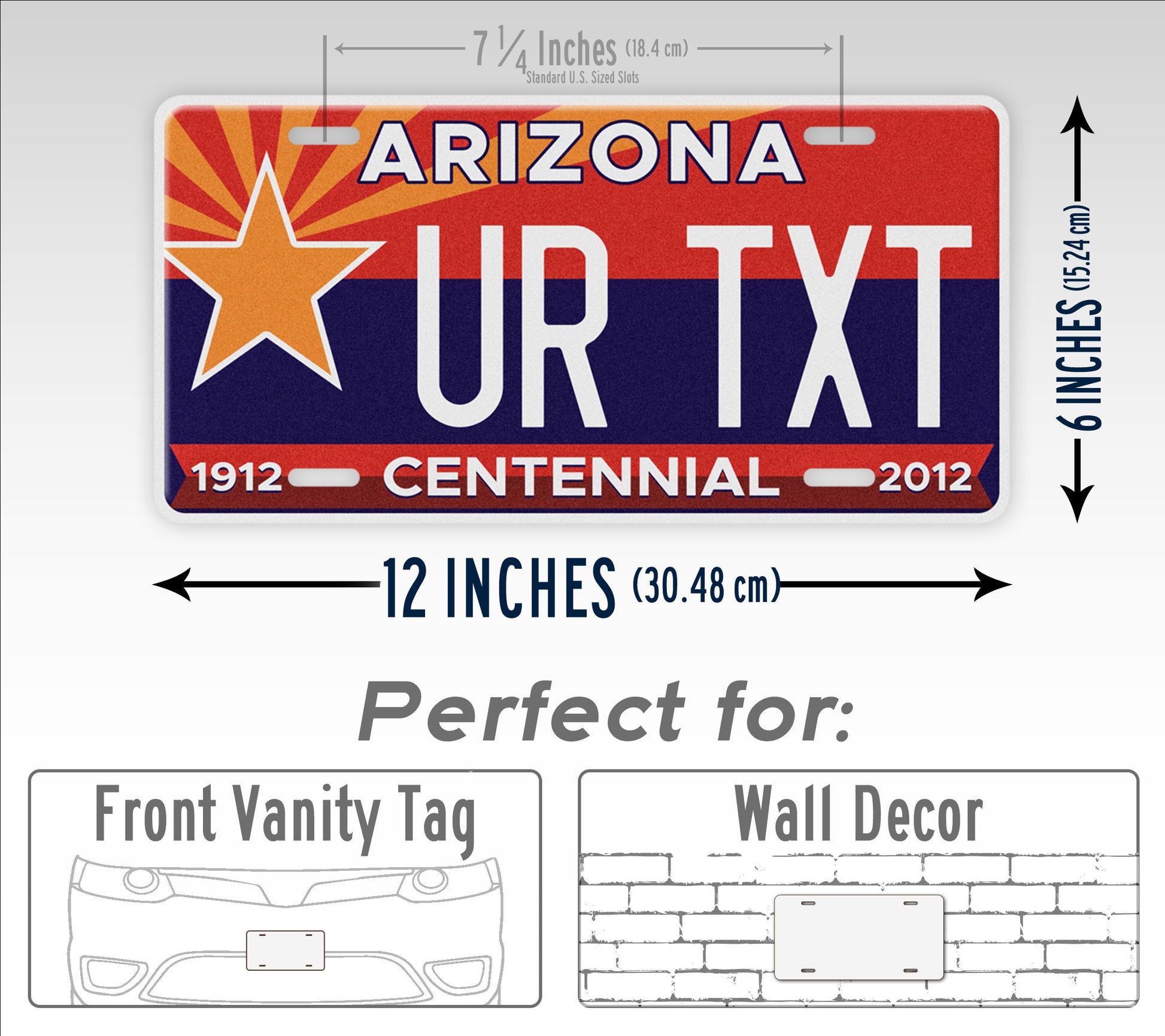This is a replica of the official Arizona license plate that celebrates 100 years of statehood.  Featuring a striped red and blue plate with your customization in white. To the left of the personalized text area is the yellow/orange five point star and rays featured on the Arizona state flag. This plate has the word, "Centennial" across the bottom between the years 1912-2012.
