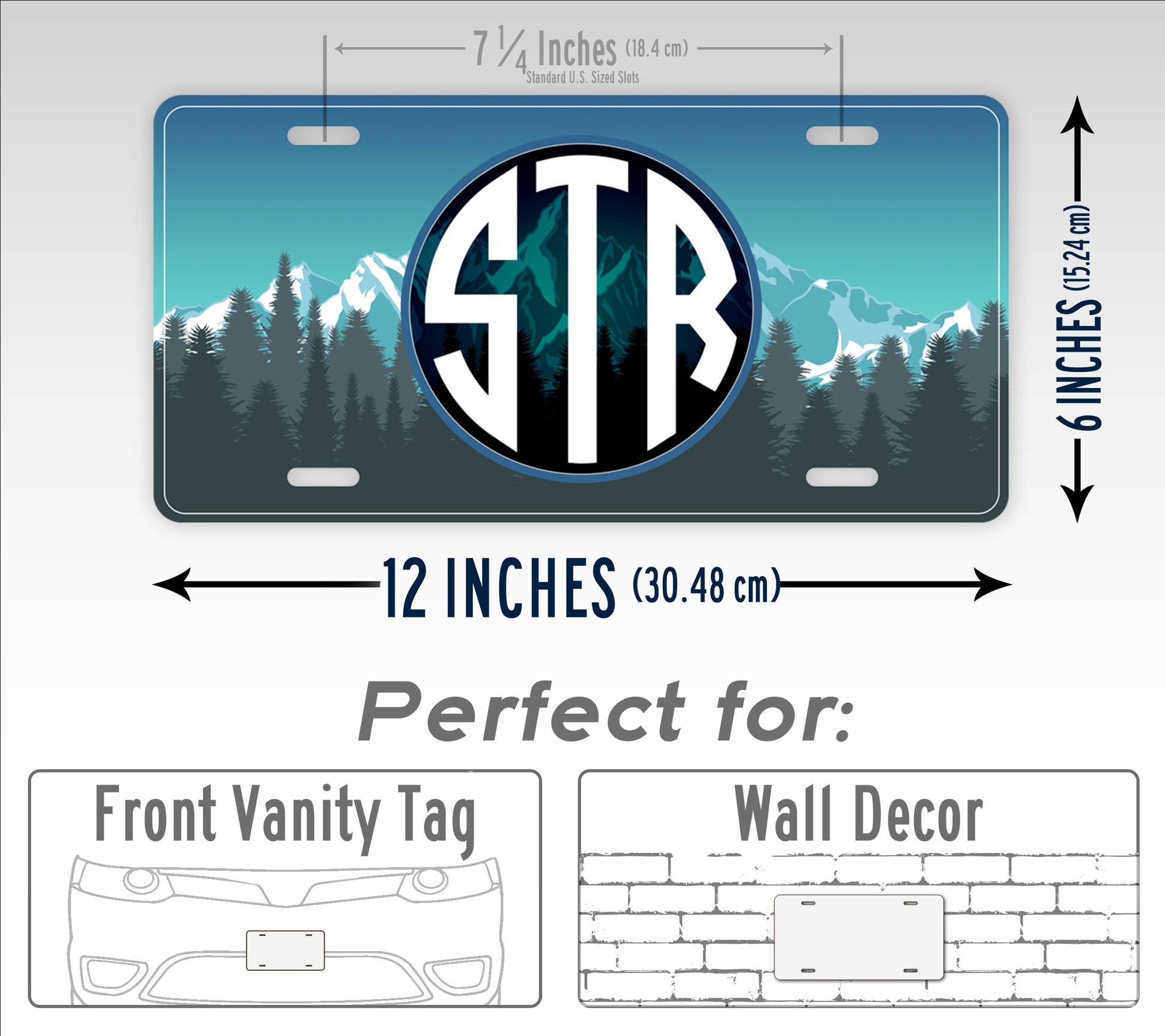 This license plate features a mountainous wilderness of pine trees and snow capped peaks as the backdrop for your monogram. This is the perfect auto tag for you that are mountain adventures. The monogram is done in white letters and Viking style font.