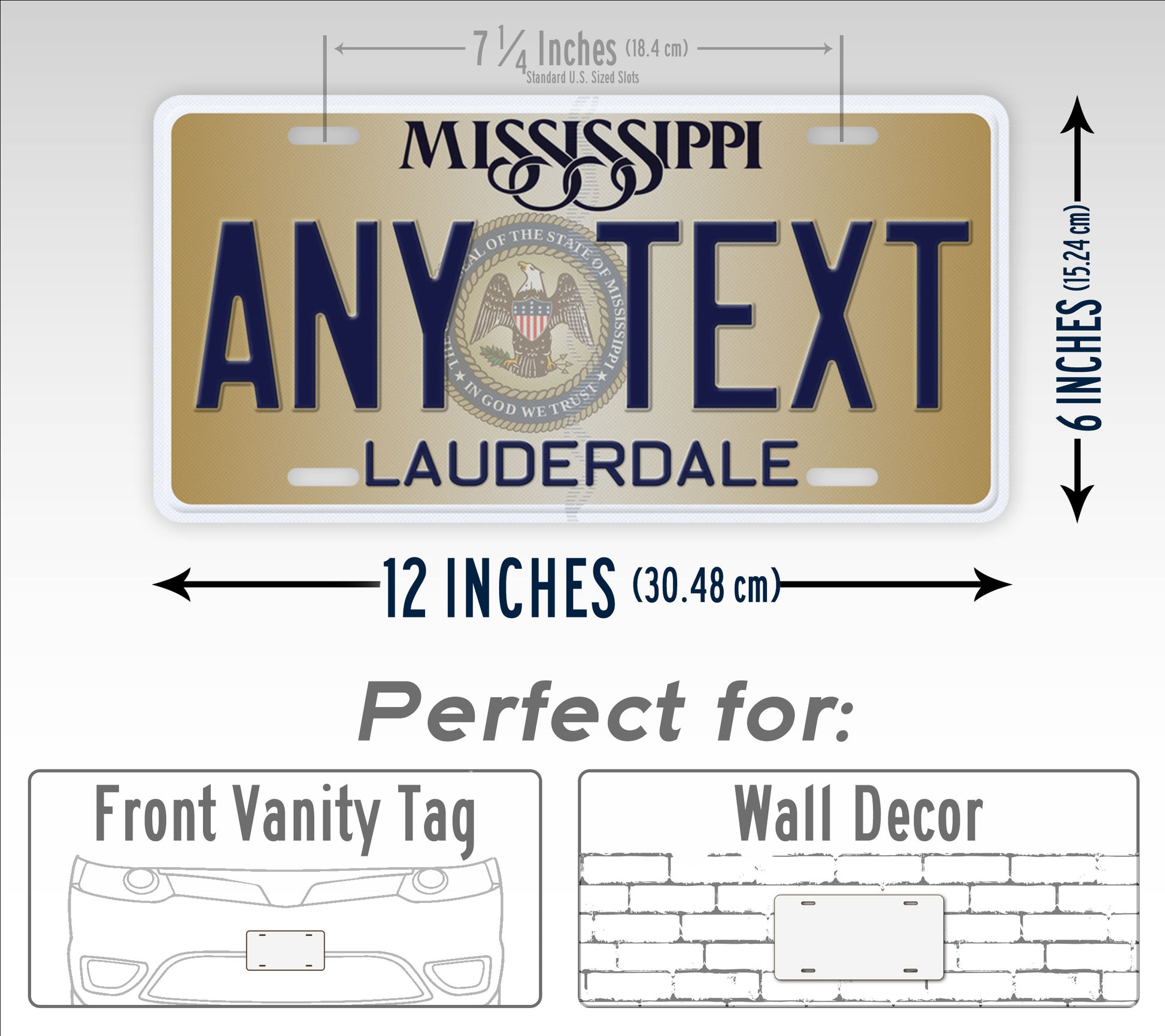 This license plate is a replica of Mississippi's official tag that was first issued in 2019. A gold color with a watermark of the seal of Mississippi make up the background of this auto tag. The text is in dark blue letters and can be customized to your liking. Both the main text and the county can be customized.