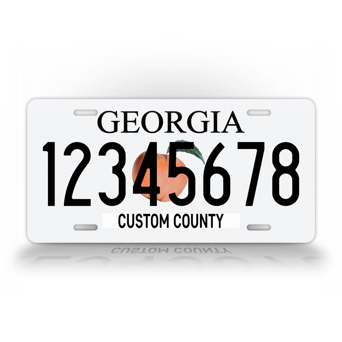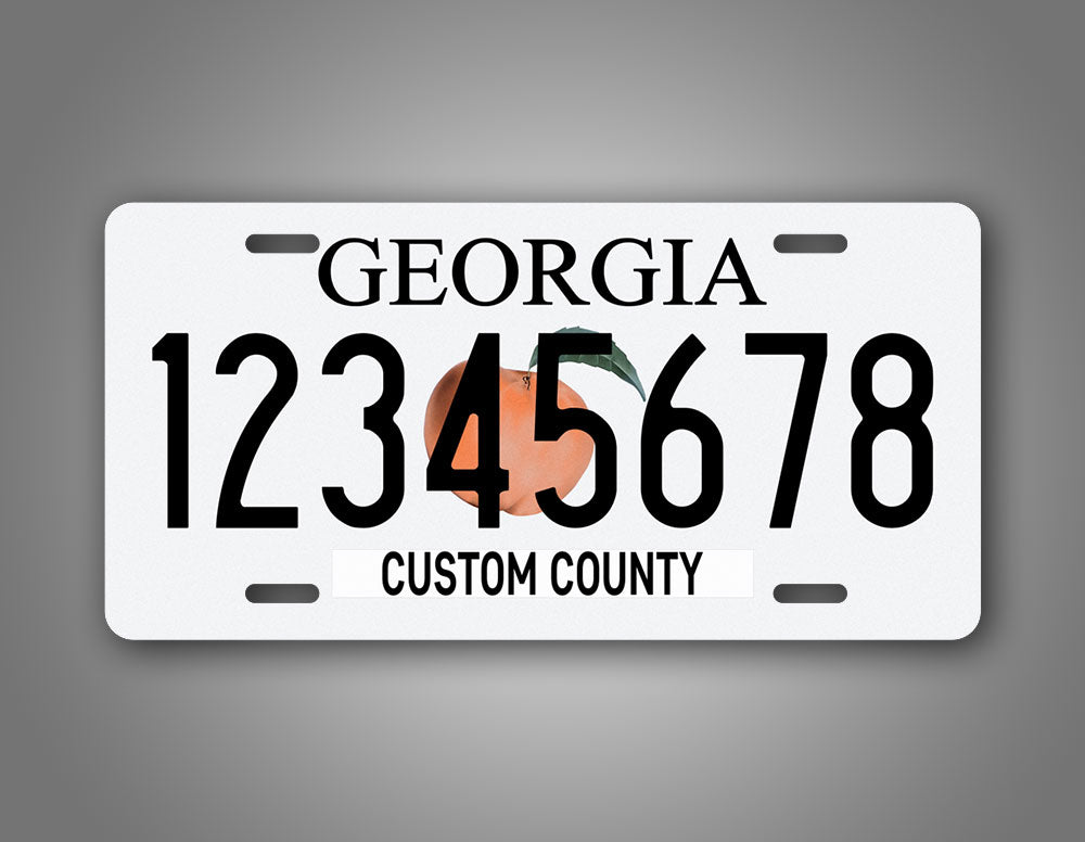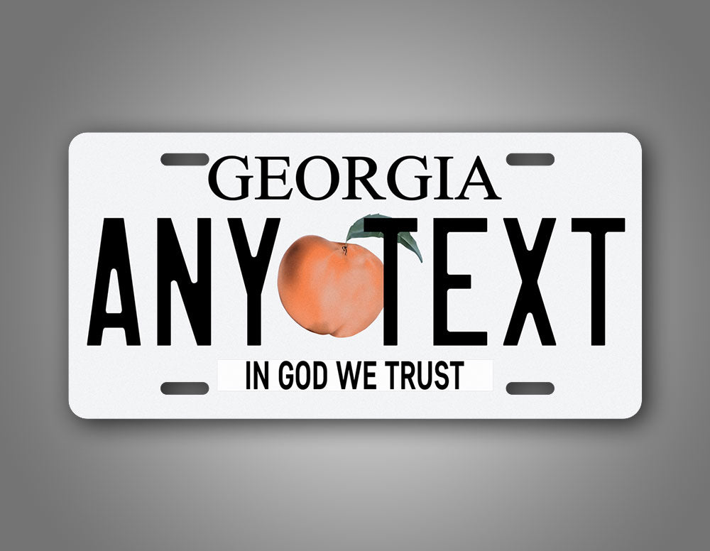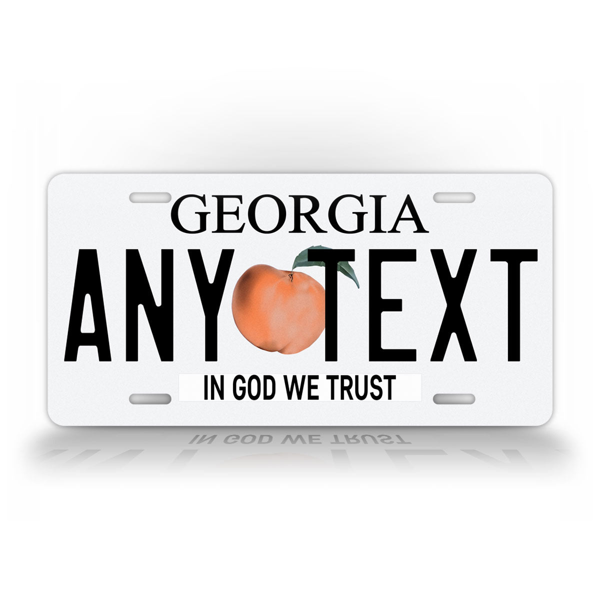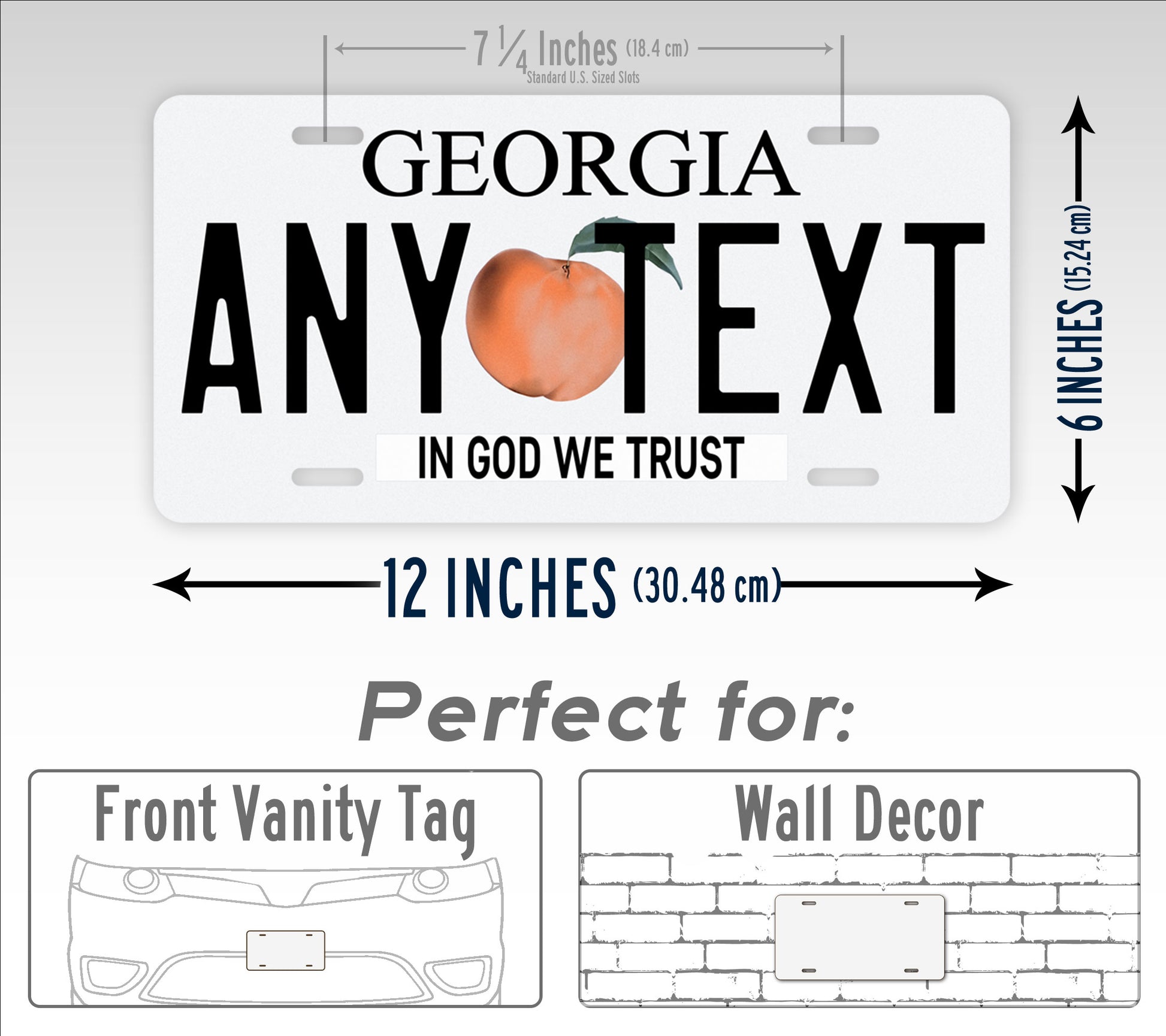 This license plate is a replica of Georgia's official tag that has been issued alongside Georgia's "peach state" plate since 2012. Customize this license plate with your own personalized text! If the custom county box is left empty, the default text will be "In God we trust."