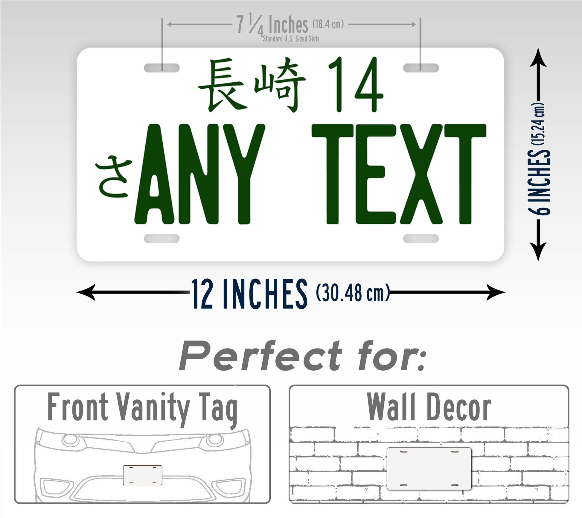 Plate dimensions are standard for U.S. plates (6" x 12"). Unless otherwise noted, all license plates are not embossed but are flat metal.