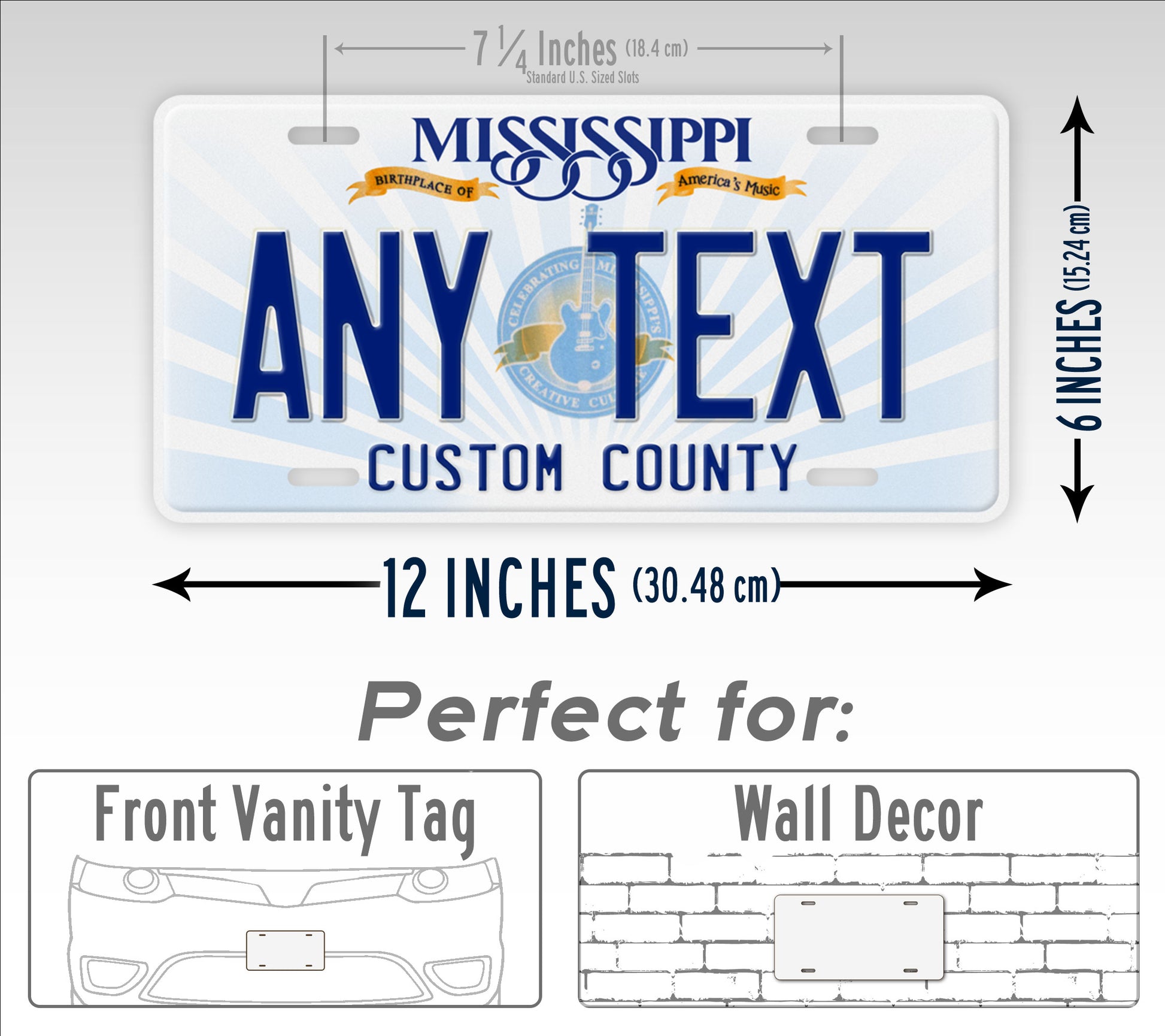 This license plate is a replica of Mississippi's official tag that was first issued in 2012 and was phased out in 2019. Mississippi is known as the birthplace of America's music and this auto celebrates that heritage. A number of renowned musicians from various genres including rock and roll, Blues, opera and gospel all have roots in Mississippi. So if you are a music lover from Mississippi this is the perfect license plate for you! Personalize it with both the main text and a county of your choice.