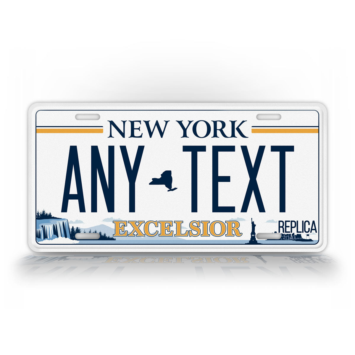 This is a replica of the New York "excelsior" plate that superseded the old "empire state" plate in April of 2020. Customize this novelty license plate with your own custom text!