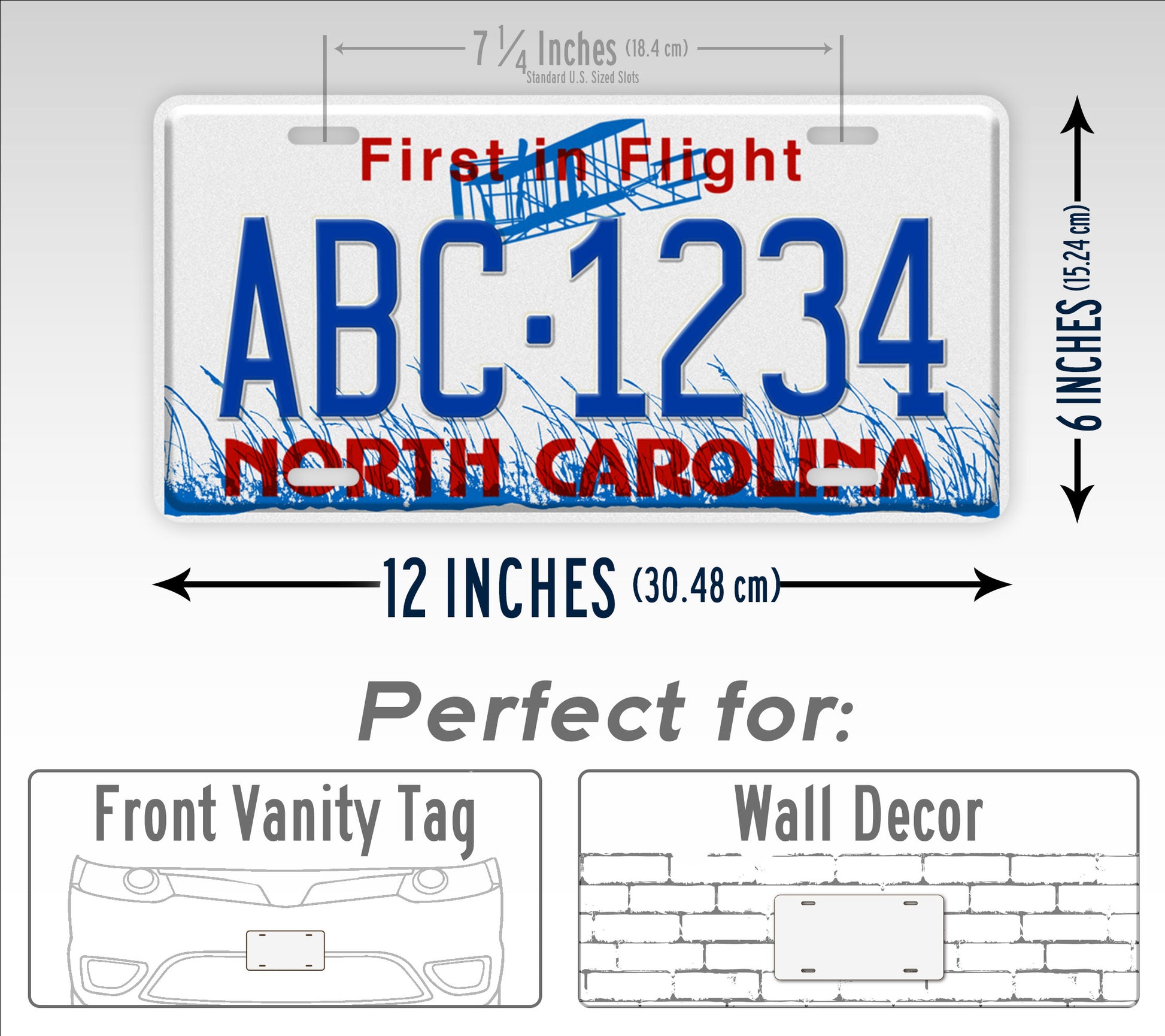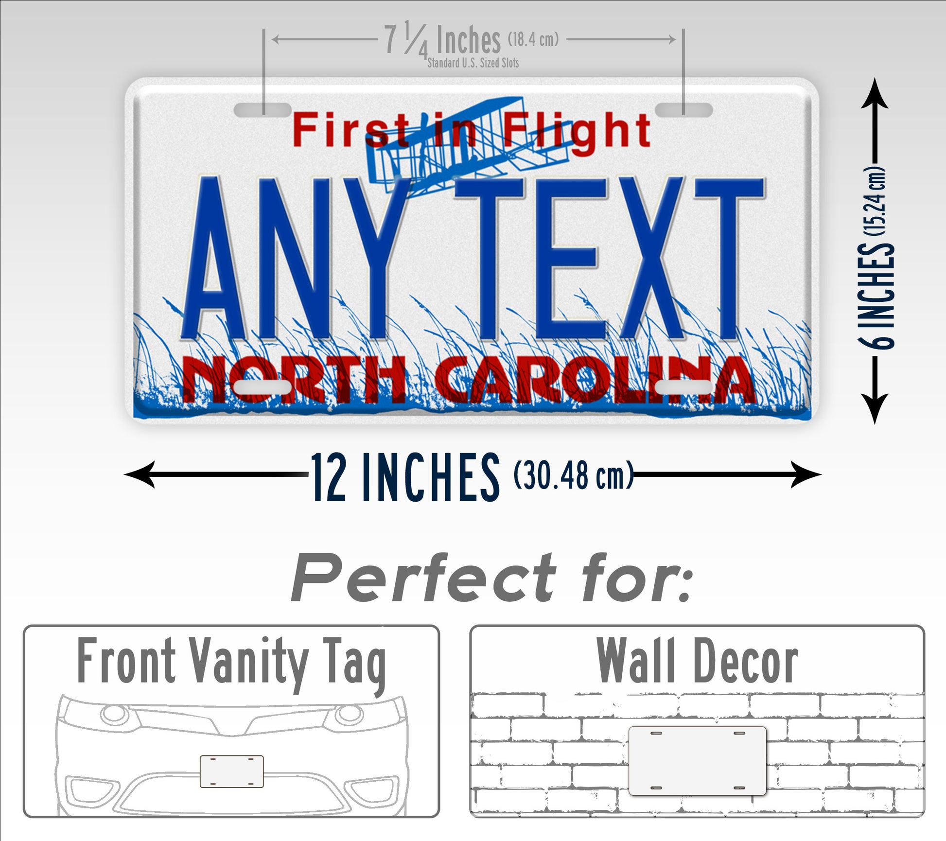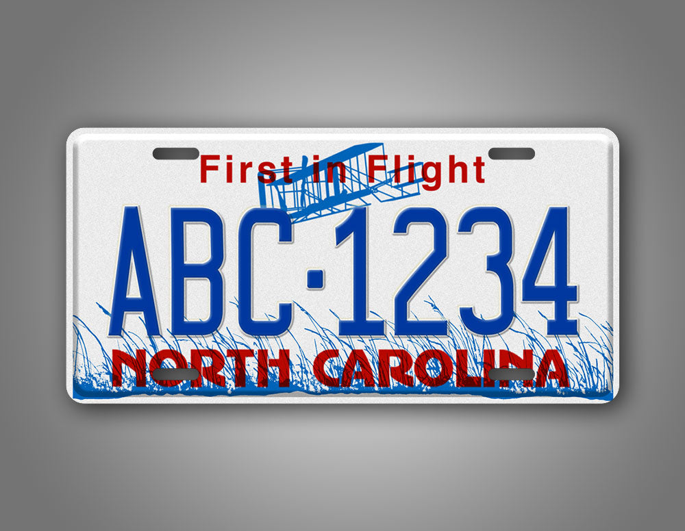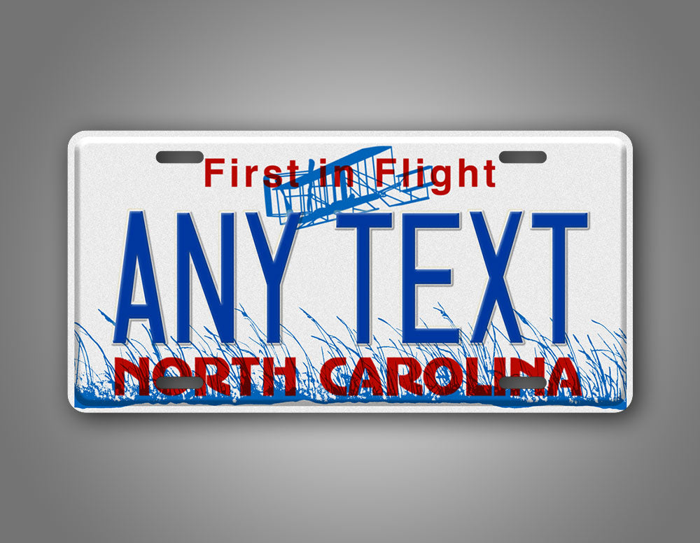 This license plate is a replica of North Carolina's official "First in Flight" tag that was first issued in 1982. Features the grasses of the North Carolina coast and the Wright Brother's plane. Customize this novelty license plate with your own text!