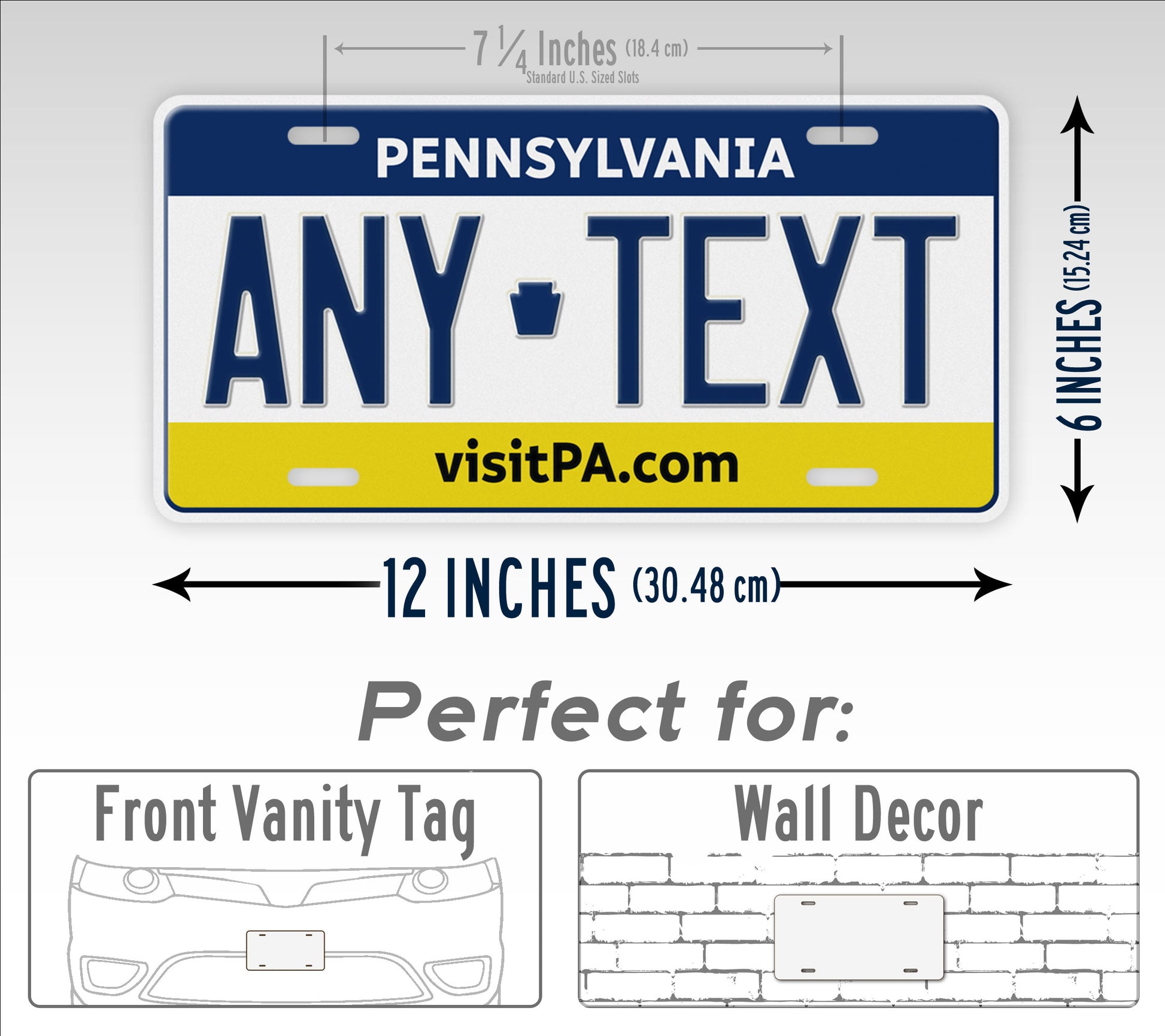This license plate is a replica of Pennsylvania's official tag that was first issued in 2004. Nothing fancy, this tag has a blue banner at the top with the word "Pennsylvania" in white, the middle is white with blue letters and the bottom is yellow with, "visitPA.com" in black.  Personalize this auto tag with the text of your choice.