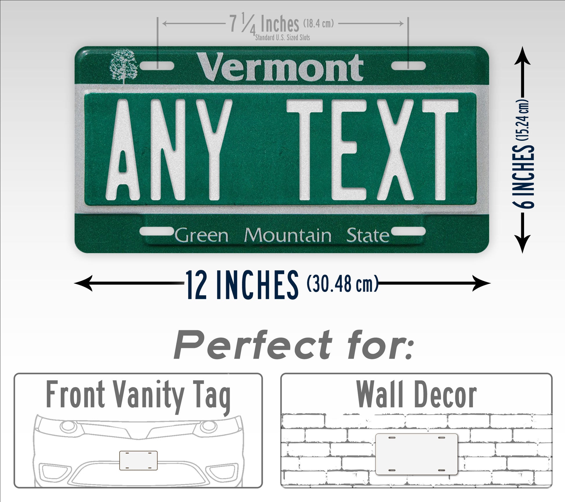 This license plate is a replica of Vermont's official tag that was issued from 1985-1989. A simple green and white tag that even to the present day has changed very little. At the top is written, "Vermont" and a white sugar maple in white. At the bottom is the state slogan, "Green Mountain State." The state obtained this nickname from the Green Mountain range that runs through much of the state. Customize this auto tag with your own choice of text.