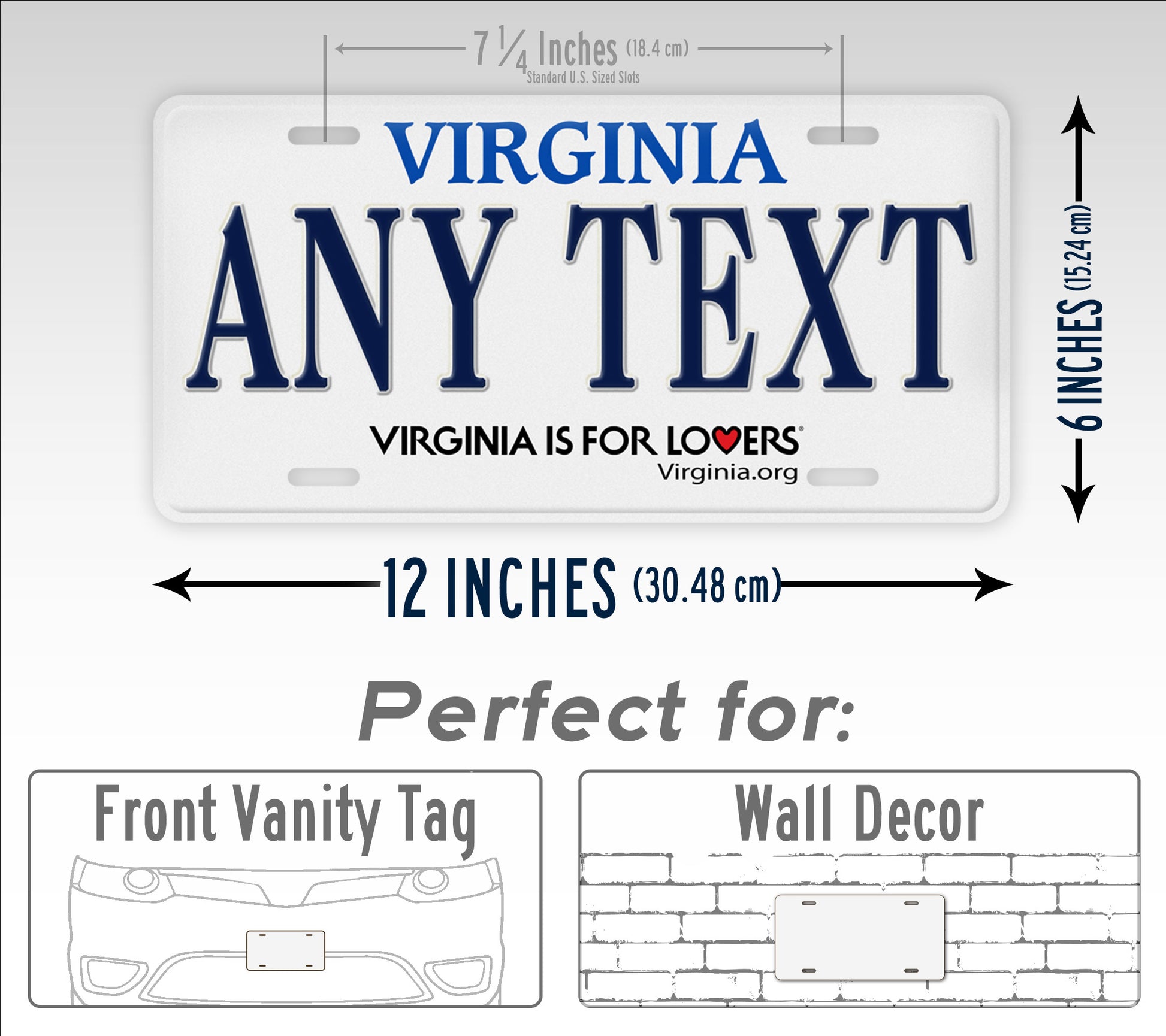 This license plate is a replica of Virginia's official tag that was first issued in 2014. A simple blue and white tag with the text, "Virginia is for Lovers" at the bottom. Customize this license plate and feel proud to be a Virginian!