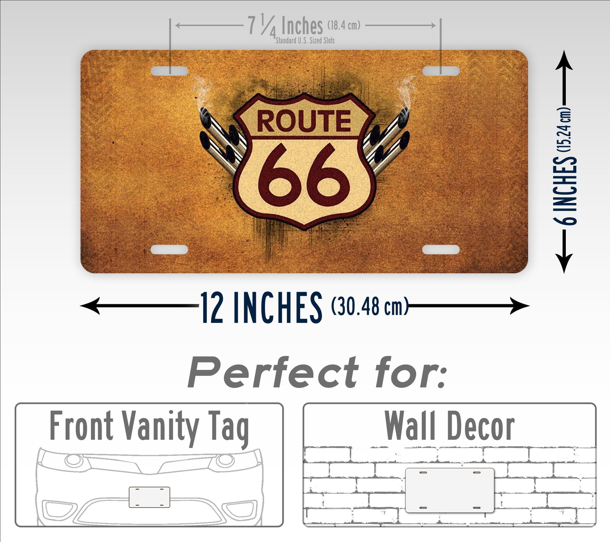 This license plate features a rustic orangish yellow background with a 66 sign and four tailpipes coming out on each side. Maybe a slight deviation from what would be considered classic Route 66, but still you have to admit this auto tag looks pretty cool. Put this plate on the front of your set of wheels are you roar down the highway!