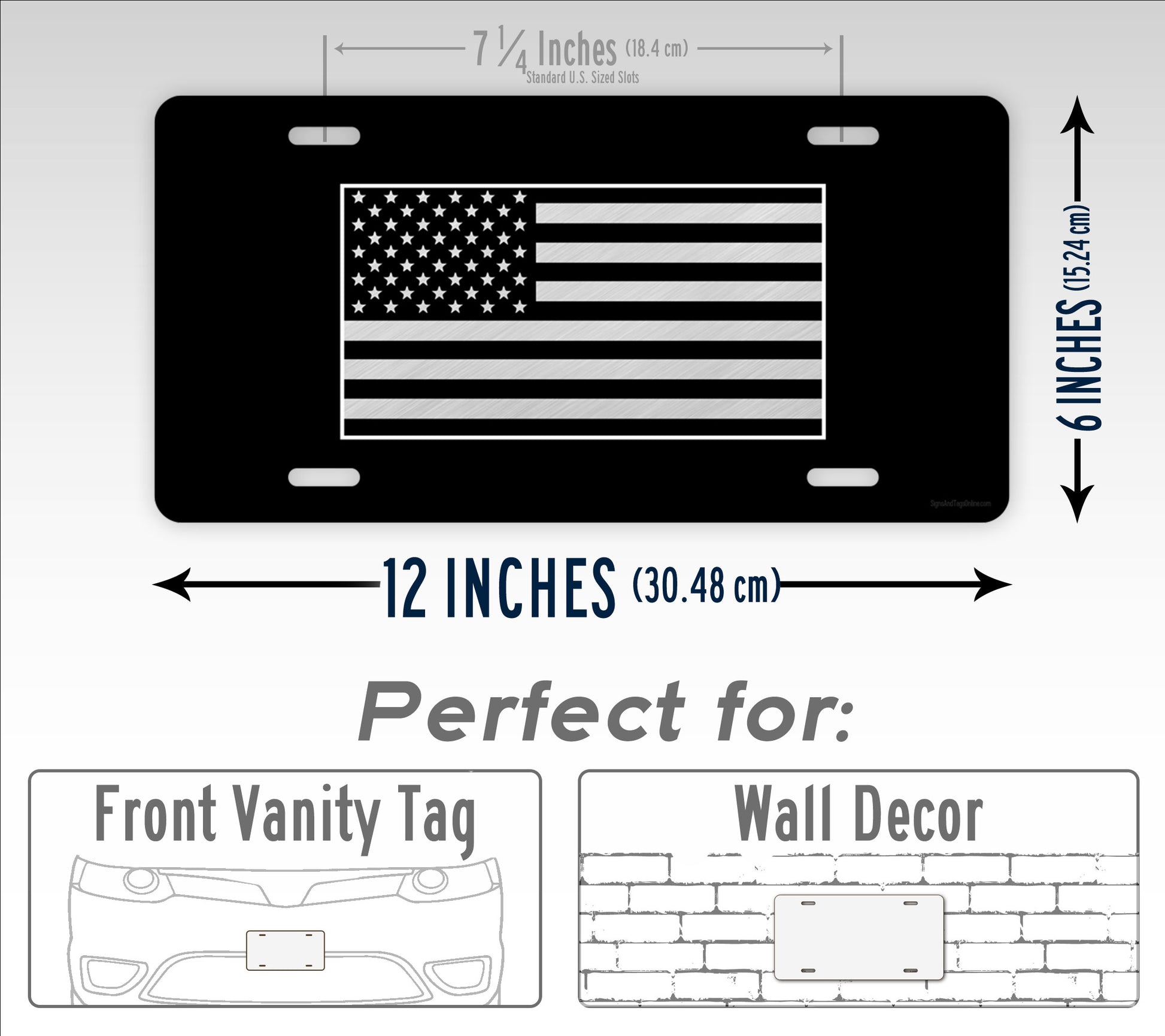 Plate dimensions are standard for U.S. plates (6" x 12"). Unless otherwise noted, all license plates are not embossed but are flat metal.