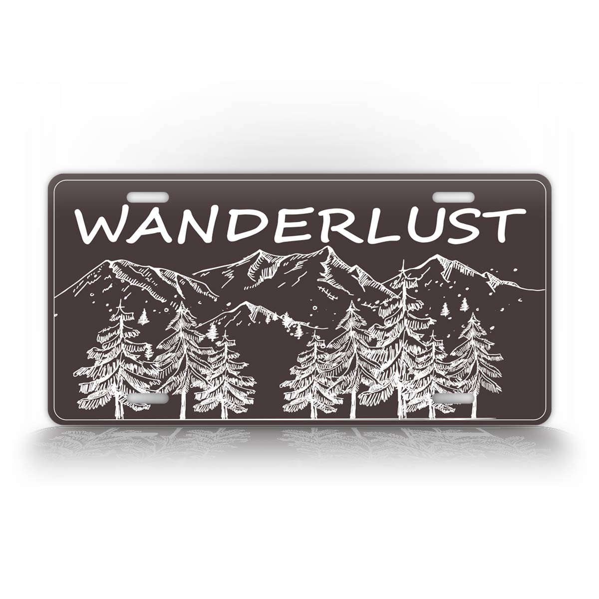 This adventurist license plate features a nice chalk style drawing of some evergreen trees and distant mountains. At the top is the text, "Wanderlust." The word, "wanderlust" simple means having a strong impulse toward traveling or wandering and was first used in 1875.
